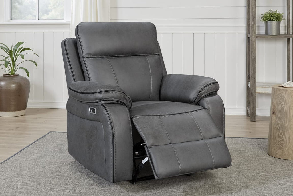 · Grey chenille recliners are luxuriously textured, adding warmth to any space.