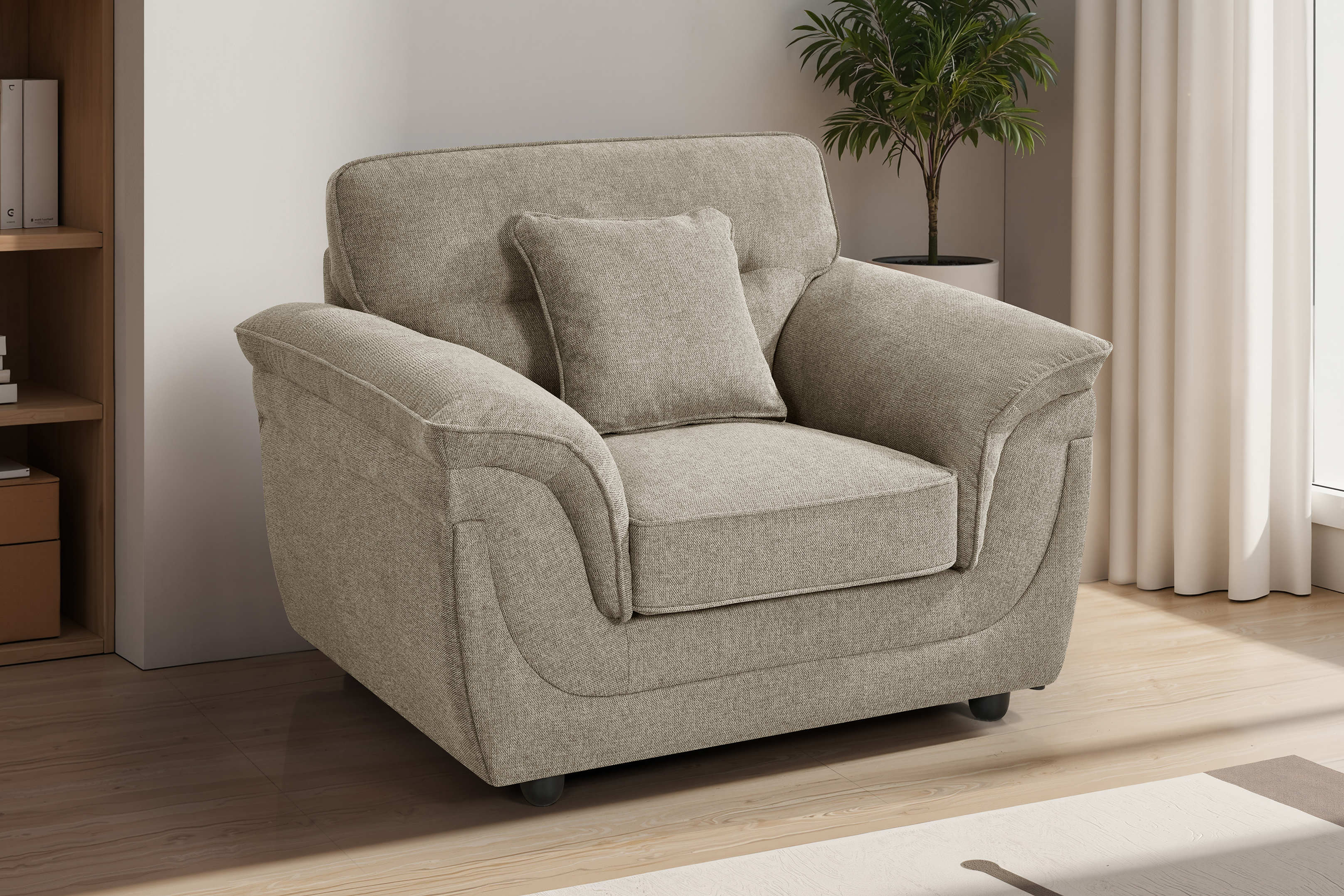 The Elliot 1 Seater Sofa includes a matching scatter cushion for added support and versatility. The durable chenille upholstery is stylish and easy to maintain.