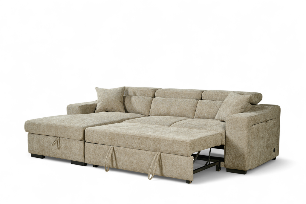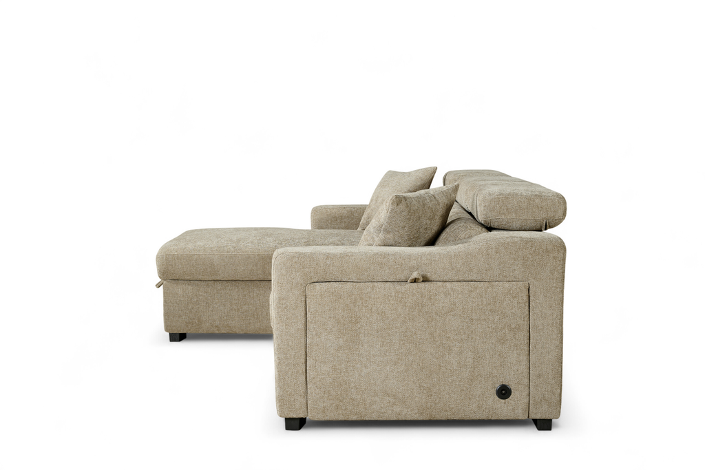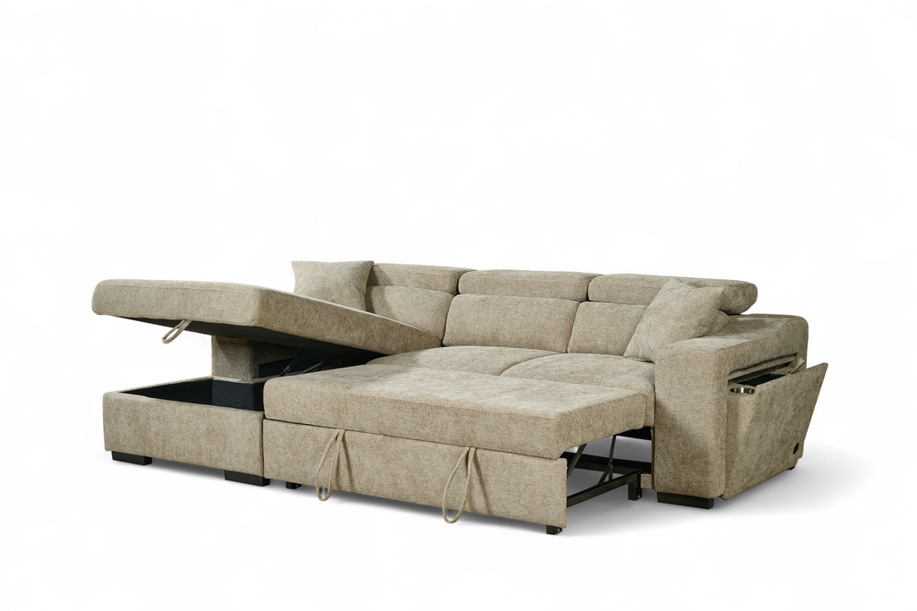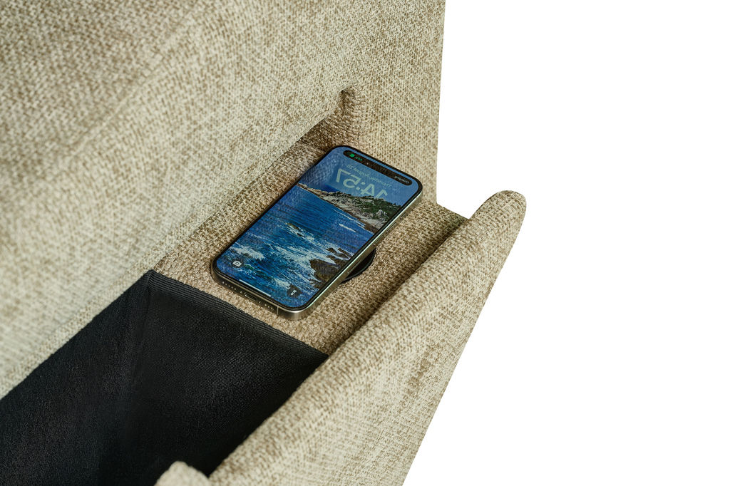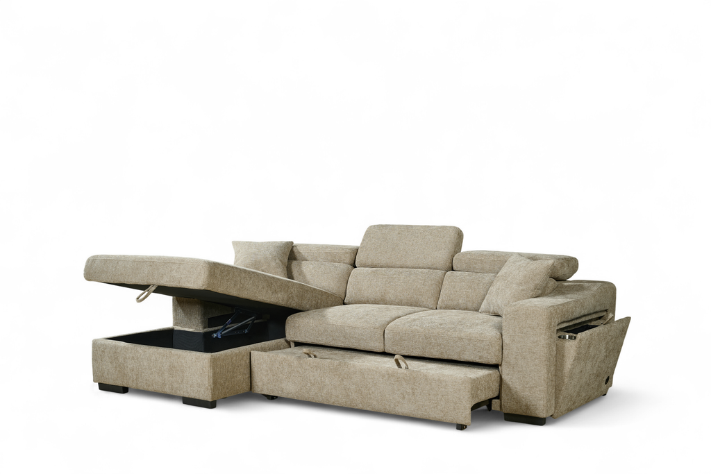 One side panel flips open to reveal a small compartment with a cupholder and wireless phone charger built in. Ideal for lounging, storing, or sleeping, the Arthur Corner Sofabed makes the most of the space it takes up.