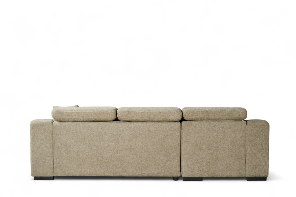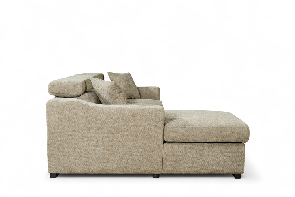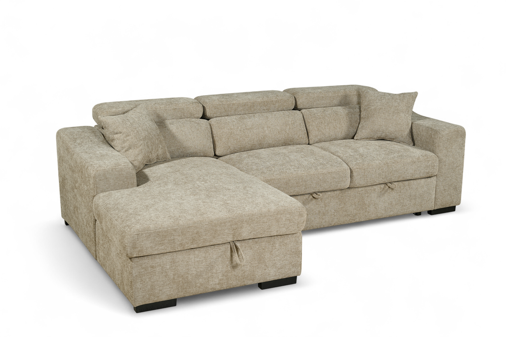 The Arthur 1C2 Corner Sofabed is a practical all-in-one design, upholstered in beige chenille fabric. It features medium-density seat cushions, adjustable headrests, and two matching scatter cushions. The chaise lifts to reveal a storage compartment for blankets or everyday clutter, and the seat base pulls out to create a double sofabed - useful for guests or extra sleeping space.