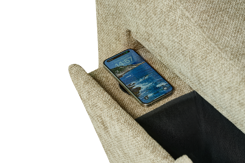 One side panel flips open to reveal a small compartment with a cupholder and wireless phone charger built in. Ideal for lounging, storing, or sleeping, the Arthur Corner Sofabed makes the most of the space it takes up.