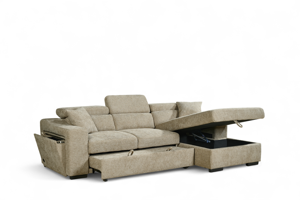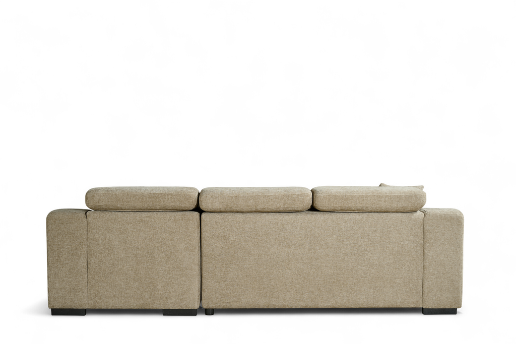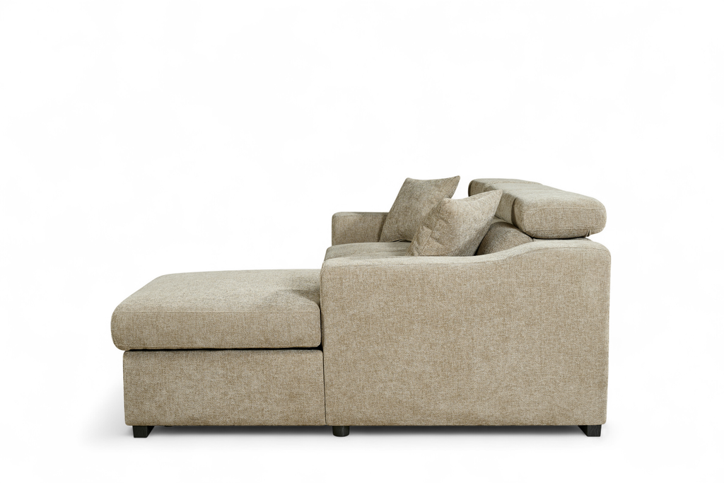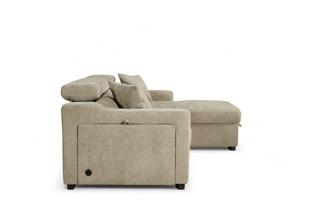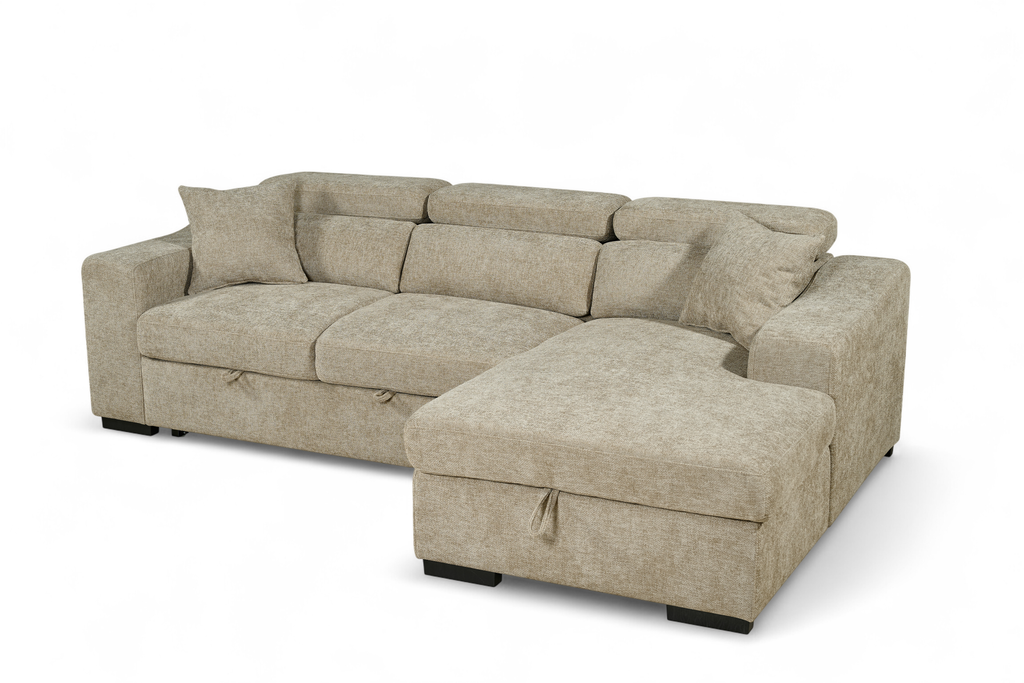 The Arthur 2C1 Corner Sofabed is a practical all-in-one design, upholstered in beige chenille fabric. It features medium-density seat cushions, adjustable headrests, and two matching scatter cushions. The chaise lifts to reveal a storage compartment for blankets or everyday clutter, and the seat base pulls out to create a double sofabed - useful for guests or extra sleeping space.