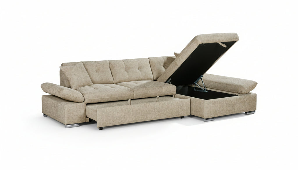 The Beige Chenille Fabric 2C1 Harry Corner Sofabed with Storage offers a practical setup for day-to-day use, with a pull-out sofabed section and a lift-up storage compartment built into the chaise. The cushions have a soft, textured chenille finish in a warm beige tone, and the tufted seat detail keeps the overall look tidy and modern.