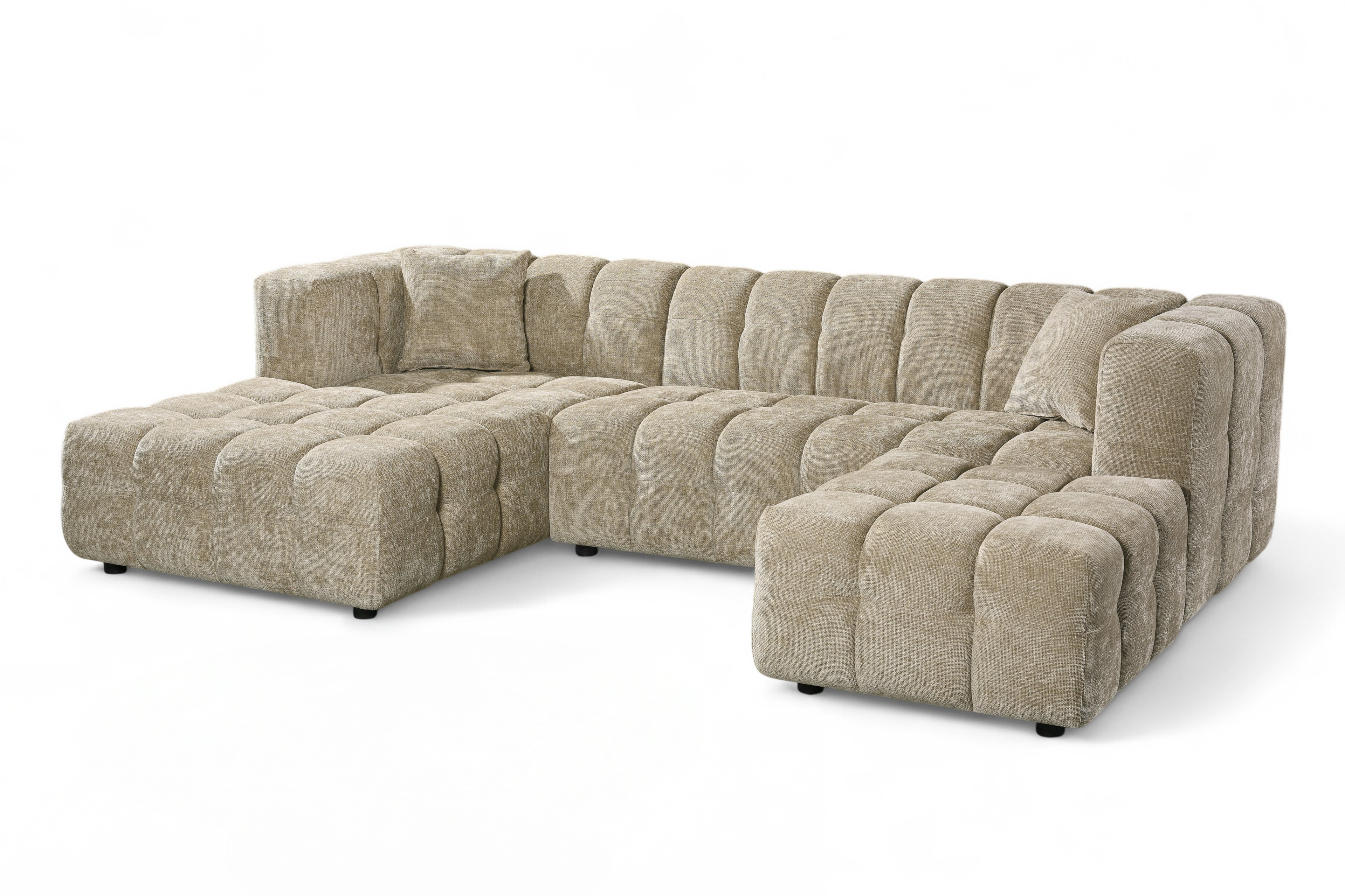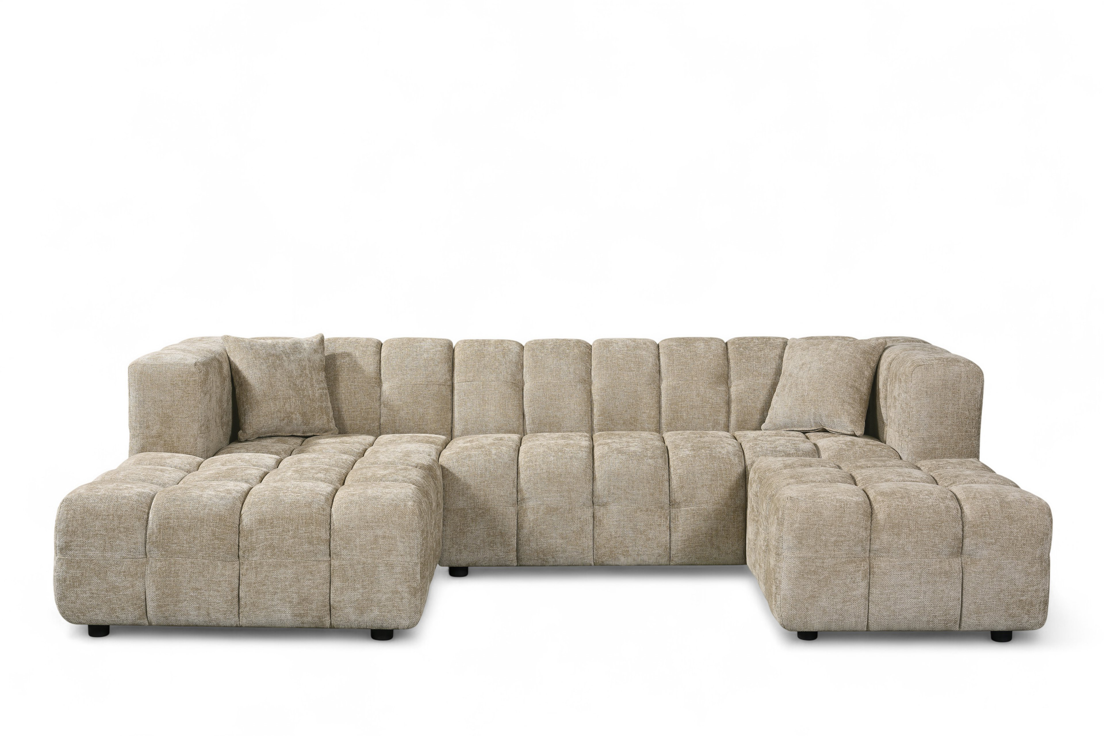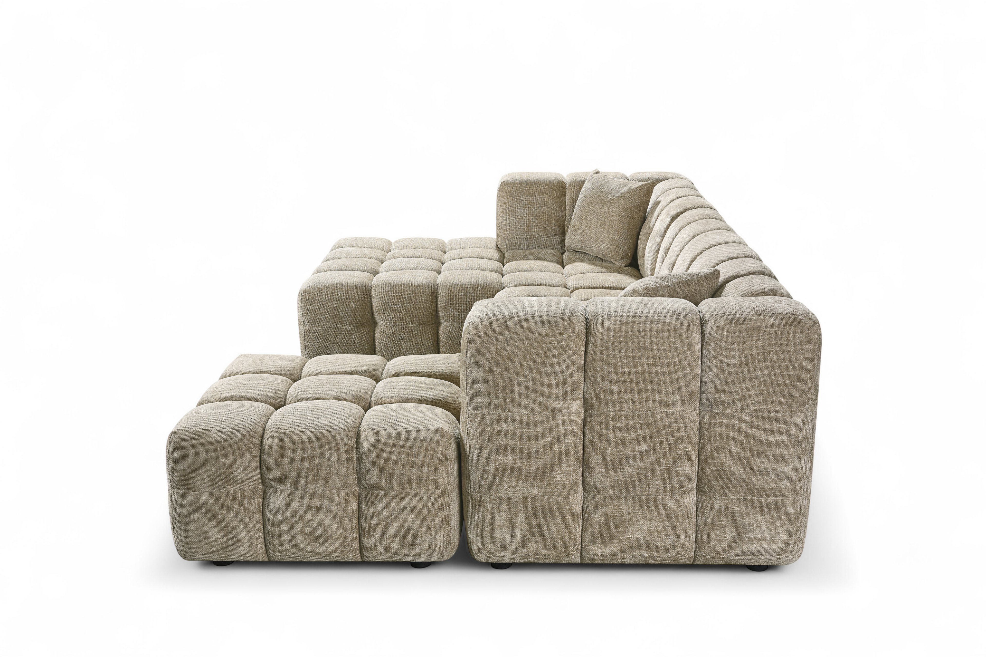 The Lugano Corner Sofa exemplifies modern design with its low profile silhouette and unique blocky structure. Ideal for modern spaces in need of a glamorous centrepiece. The Lugano range is built on a sturdy hardwood frame, with sprung seats filled with dense foam. This, with addition of a matching ottoman and a chaise end section, makes the Lugano Corner Sofa the perfect pick for daily use, providing both comfort and style. The upholstery showcases beige chenille fabric; thanks to this upholstery, the Lugano Corner Sofa will suit a variety of living rooms.