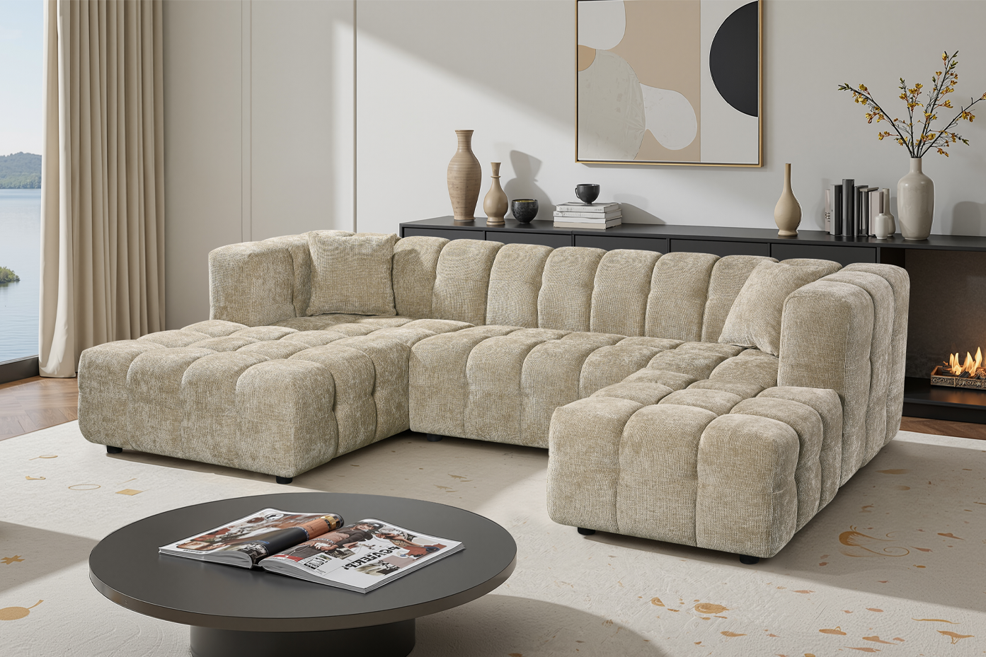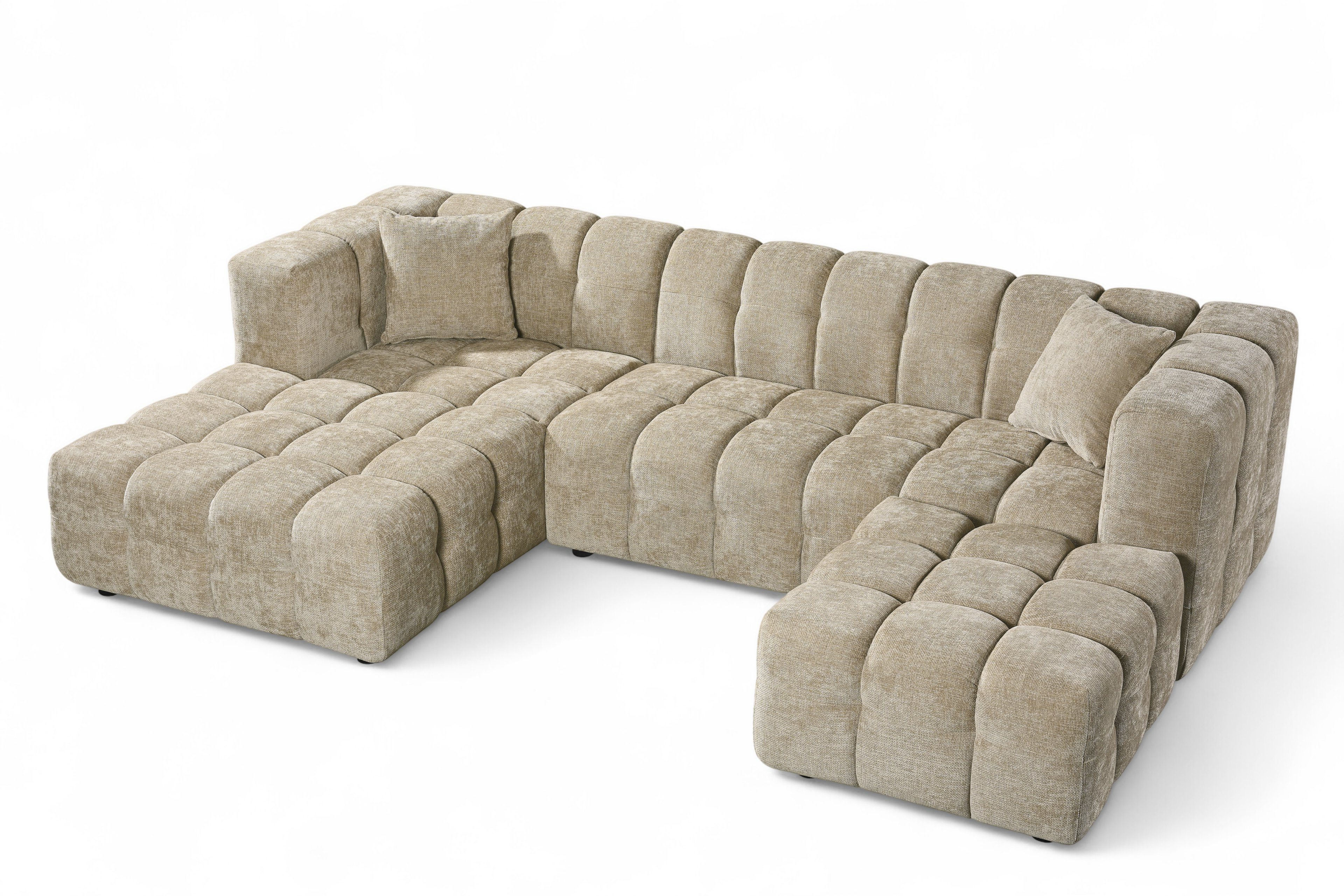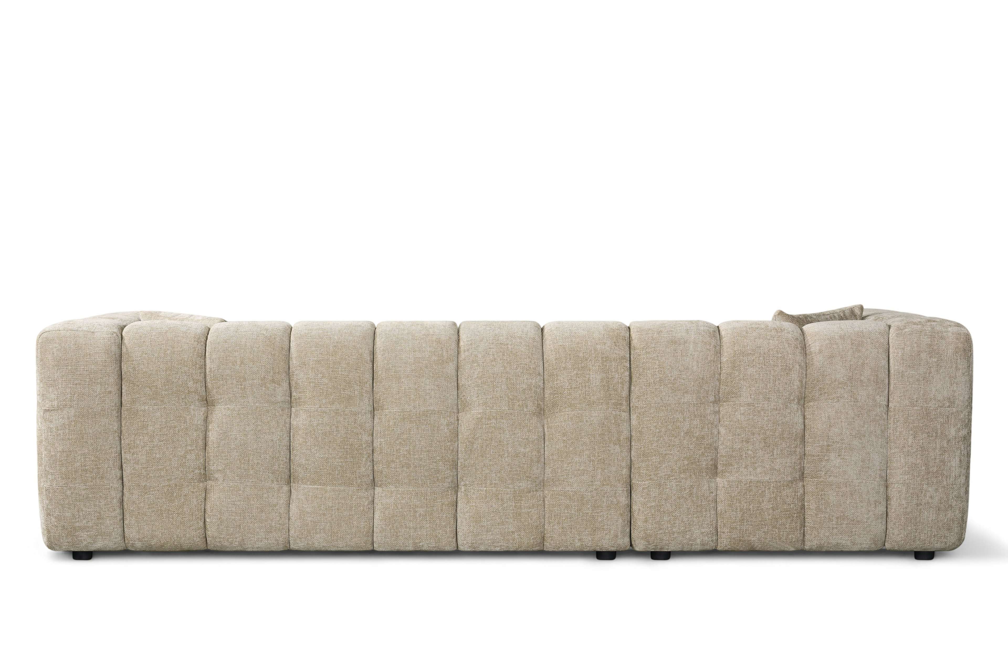 The Lugano Corner Sofa exemplifies modern design with its low profile silhouette and unique blocky structure. Ideal for modern spaces in need of a glamorous centrepiece. The Lugano range is built on a sturdy hardwood frame, with sprung seats filled with dense foam. This, with addition of a matching ottoman and a chaise end section, makes the Lugano Corner Sofa the perfect pick for daily use, providing both comfort and style. The upholstery showcases beige chenille fabric; thanks to this upholstery, the Lugano Corner Sofa will suit a variety of living rooms.