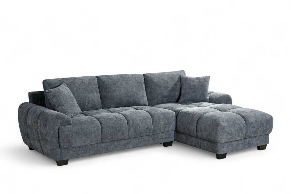 The Jack Corner Sofa features a clean, contemporary silhouette with subtly rounded edges and deep, generously cushioned seating that offers a cosy, quilted appearance. The structured seat sections are defined by soft stitching, giving the upholstery a plush and padded look that enhances its welcoming feel. This piece blends modern design with everyday practicality, making it an ideal choice for a stylish yet comfortable home. Wrapped in blue chenille upholstery, this corner sofa offers both style and comfort.