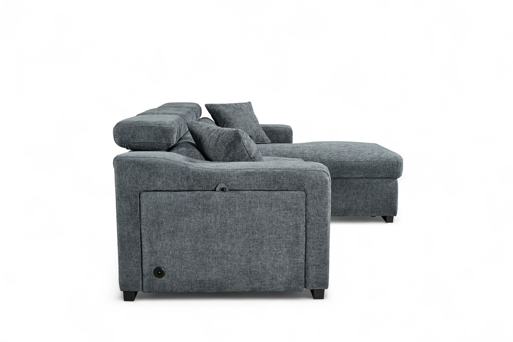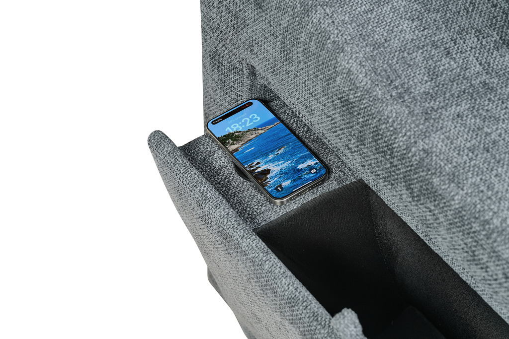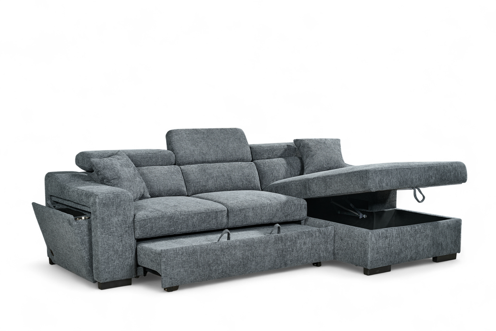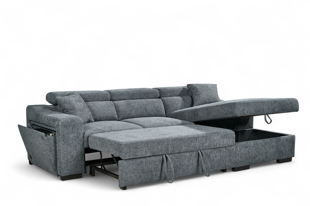 One side panel flips open to reveal a small compartment with a cupholder and wireless phone charger built in. Ideal for lounging, storing, or sleeping, the Arthur Corner Sofabed makes the most of the space it takes up.