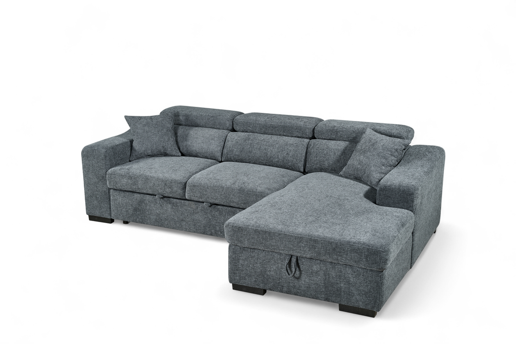The Arthur 2C1 Corner Sofabed is a practical all-in-one design, upholstered in blue chenille fabric. It features medium-density seat cushions, adjustable headrests, and two matching scatter cushions. The chaise lifts to reveal a storage compartment for blankets or everyday clutter, and the seat base pulls out to create a double sofabed - useful for guests or extra sleeping space.
