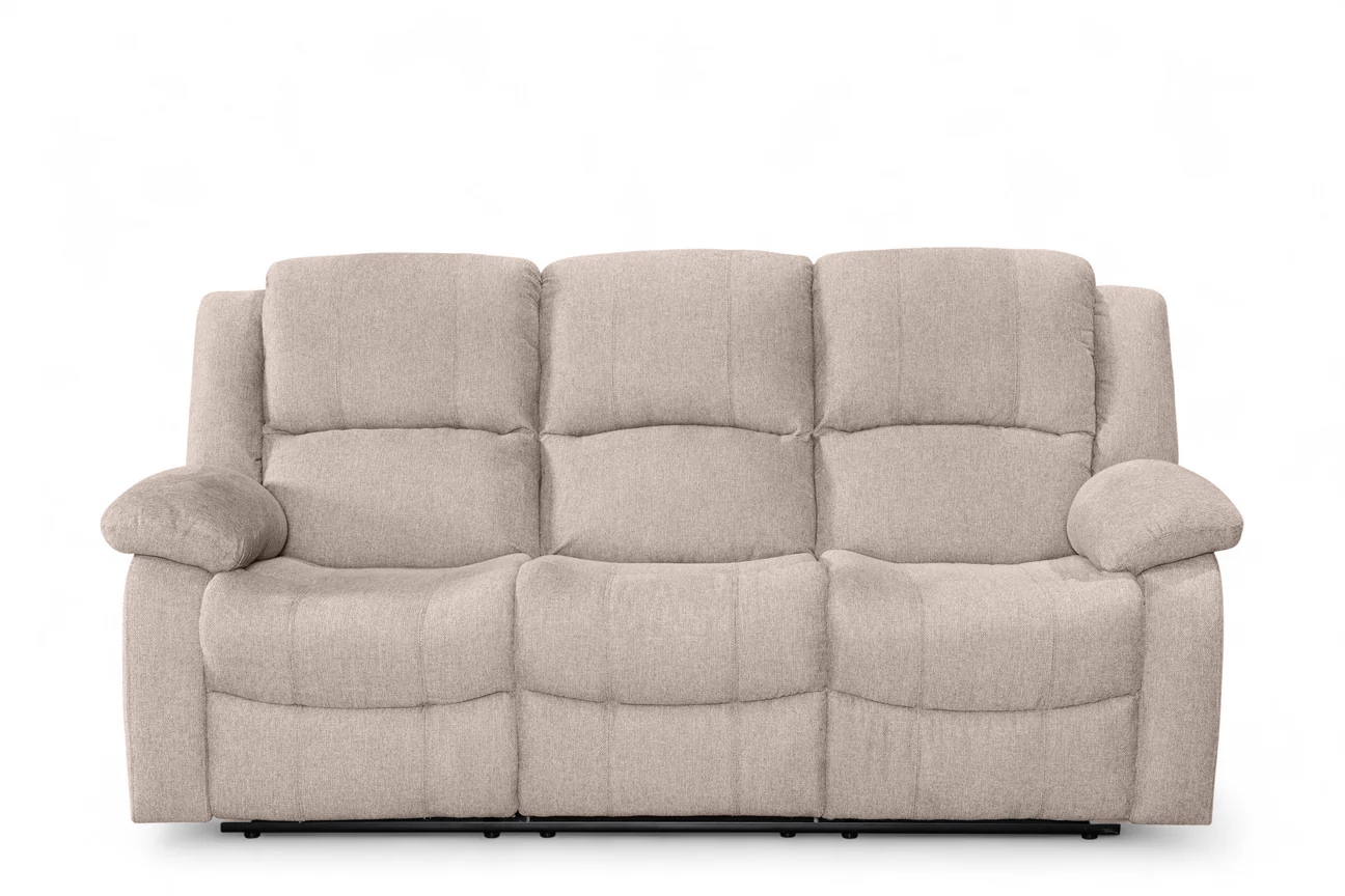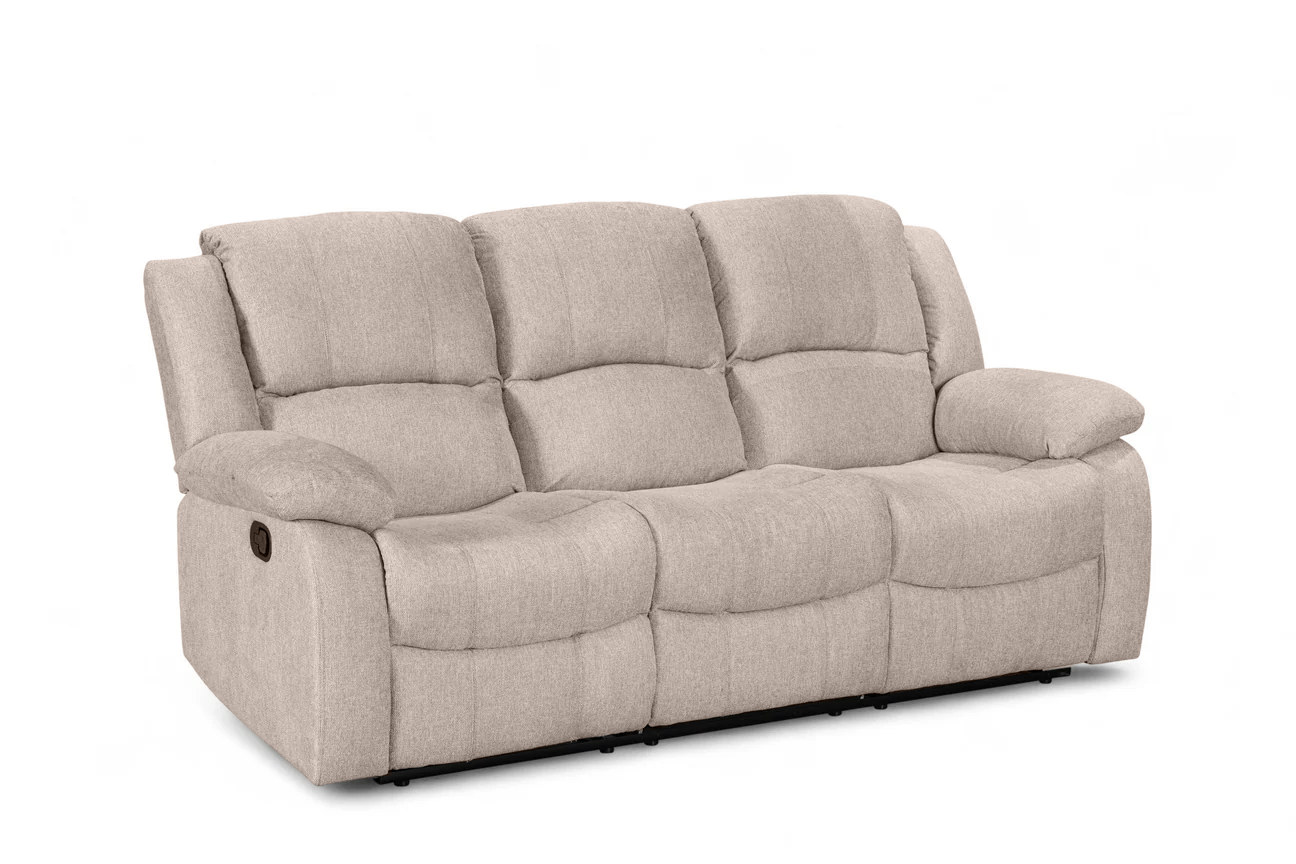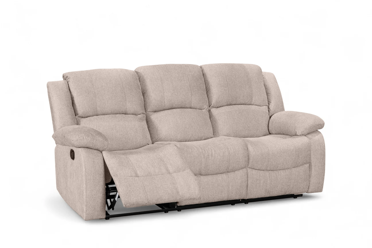 The Beige Fabric 3 Seater Varesa Recliner Sofa offers a comfortable, supportive seat with padded cushioning across the back, arms, and footrest areas. Its manual reclining mechanism allows you to adjust into a laid-back position with a pull-lever, making it suitable for everyday relaxation.