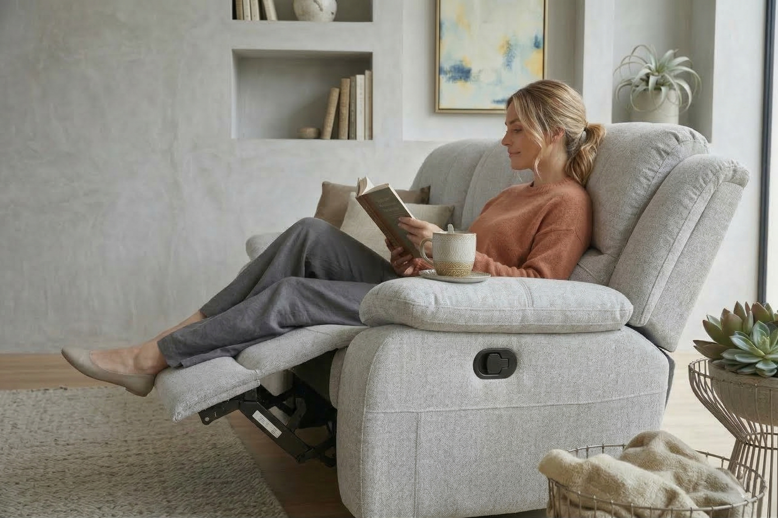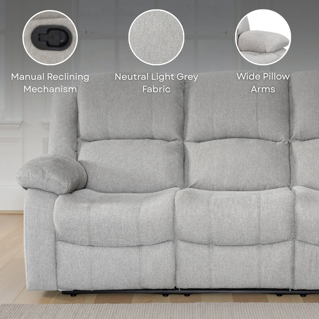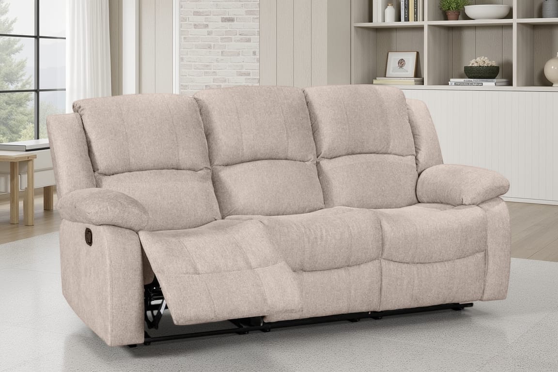 The Beige Fabric 3 Seater Varesa Recliner Sofa offers a comfortable, supportive seat with padded cushioning across the back, arms, and footrest areas. Its manual reclining mechanism allows you to adjust into a laid-back position with a pull-lever, making it suitable for everyday relaxation.