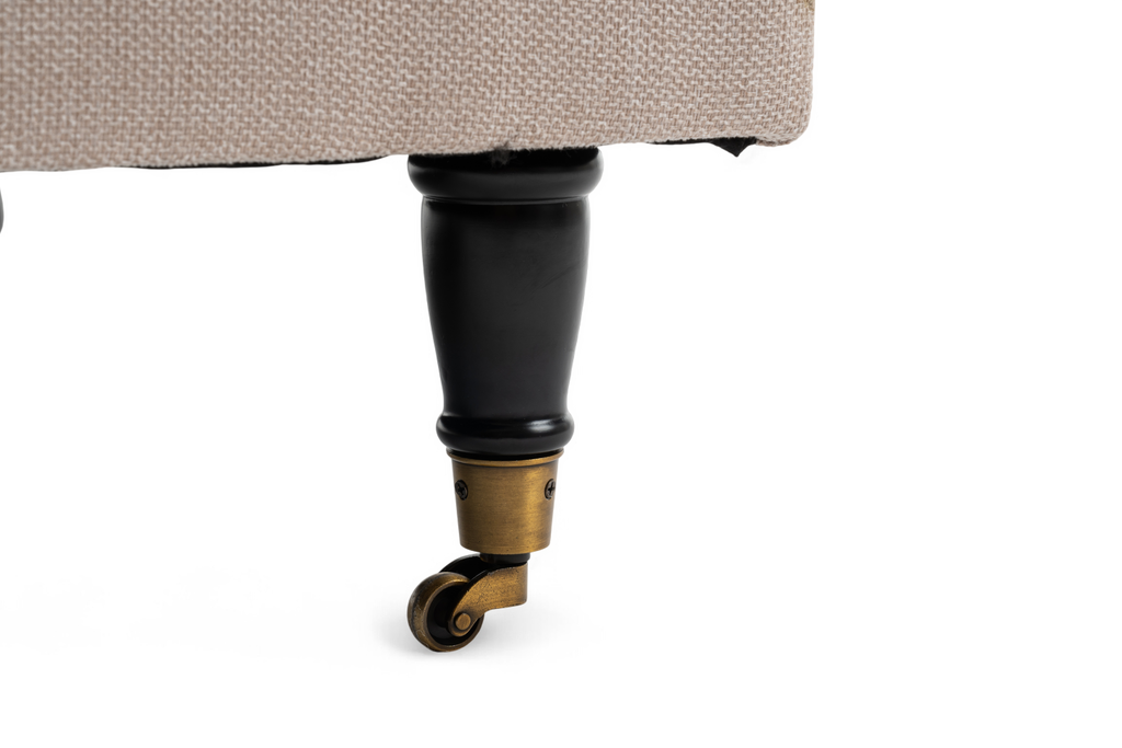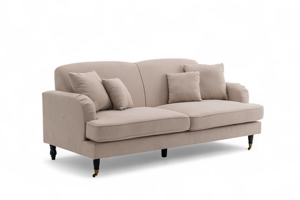 The Fabric Beige 3 Seater Ashton Sofa maximises seating options without compromising on comfort or style. Its metal castors in the front and wooden legs not only add an attractive accent but also provide stability and durability. Crafted on a wooden frame, this sofa ensures long-lasting use for years to come.