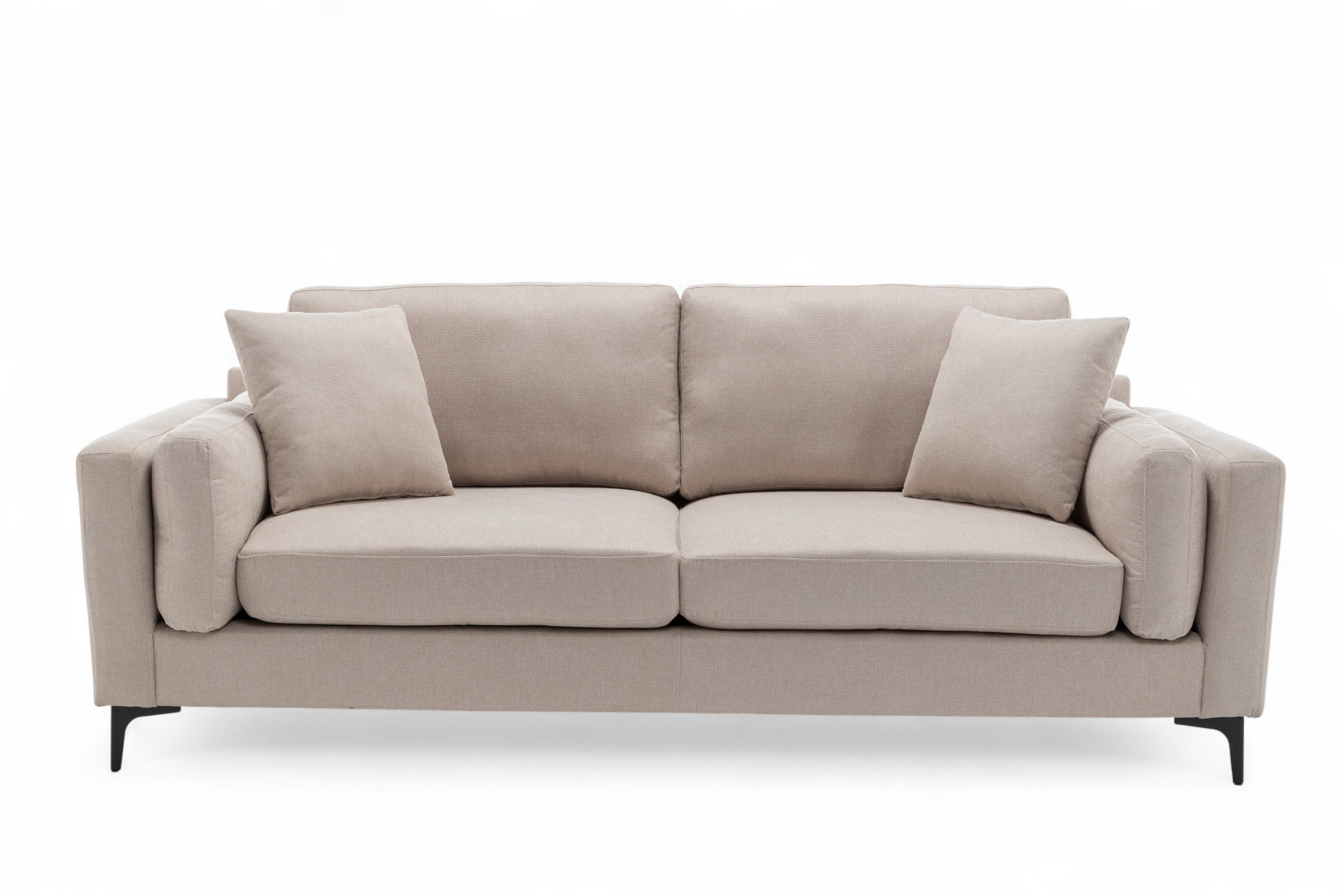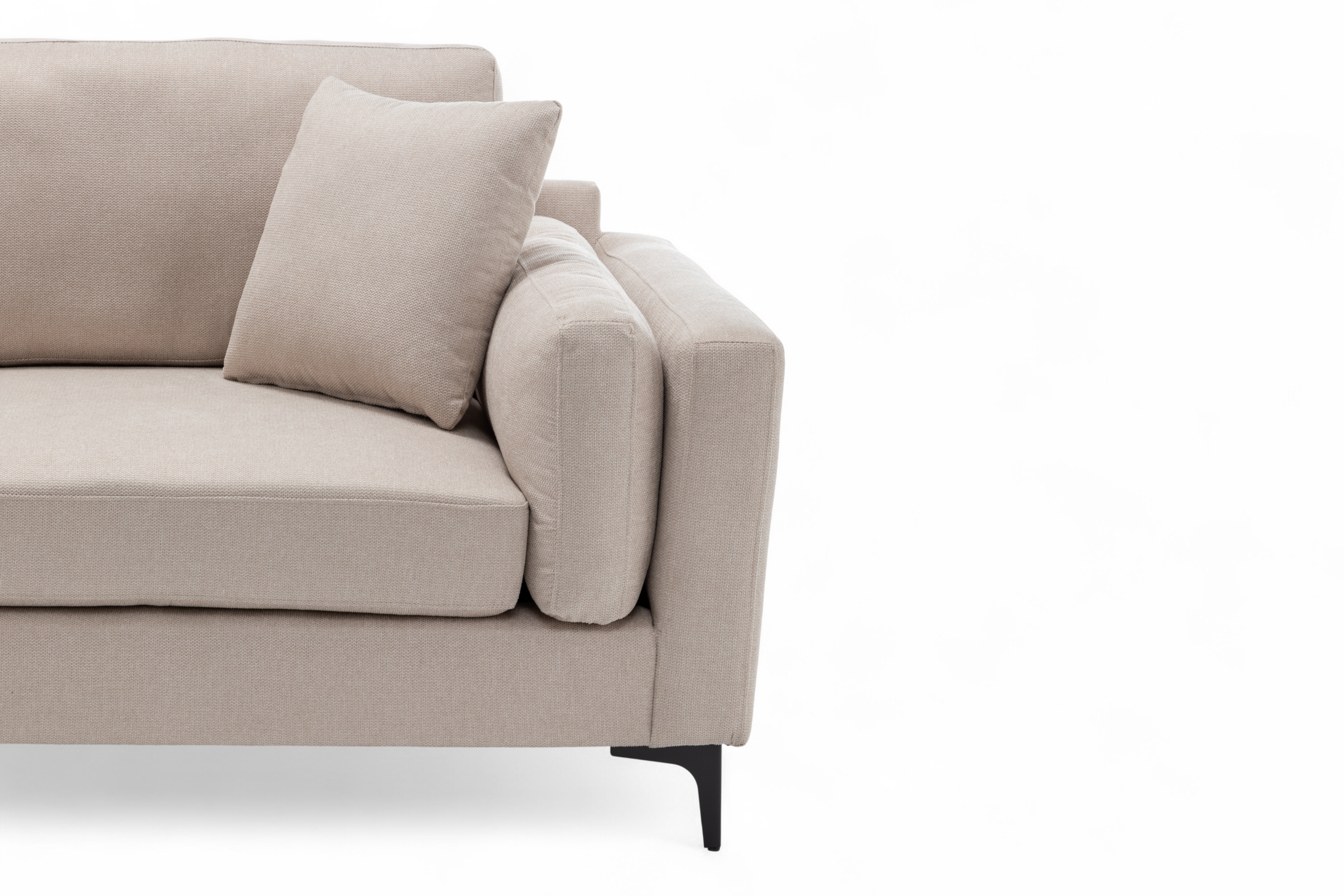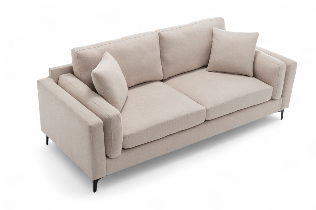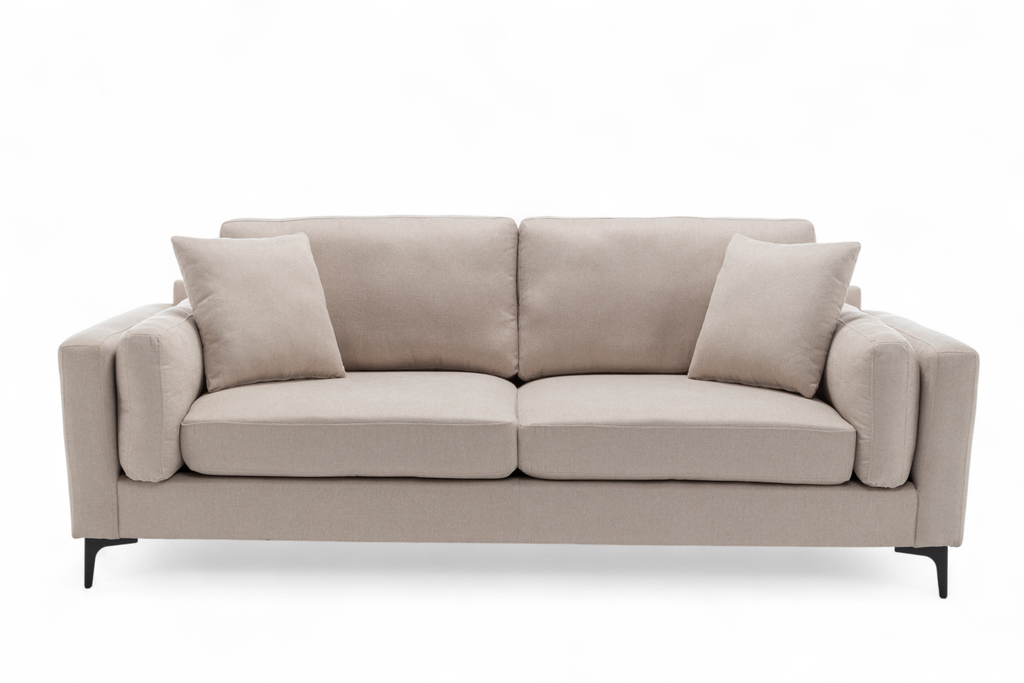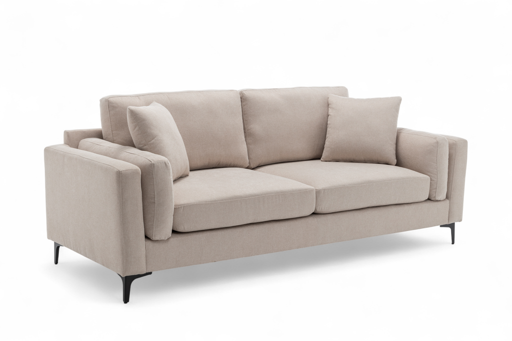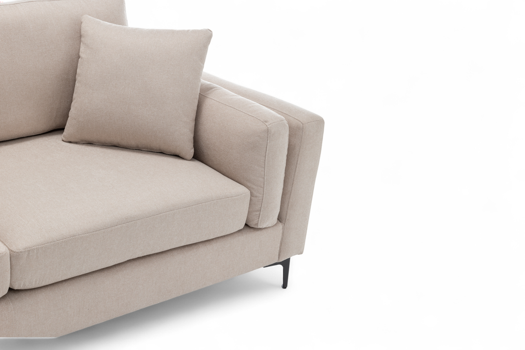 The Marghera is an elegant, contemporary-style sofa upholstered in beige fabric. It is built on a hardwood frame, with pocket-sprung medium density foam-filled seats. Alongside the fixed backrest cushions, it comes with matching accent cushions and side cushions. The black angled feet add to the modern silhouette of this sofa. This 3 seater variant is quite compact and perfect for a variety of spaces, whether used on its own or as part of a bigger ensemble.