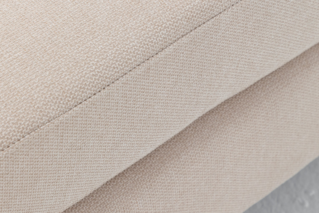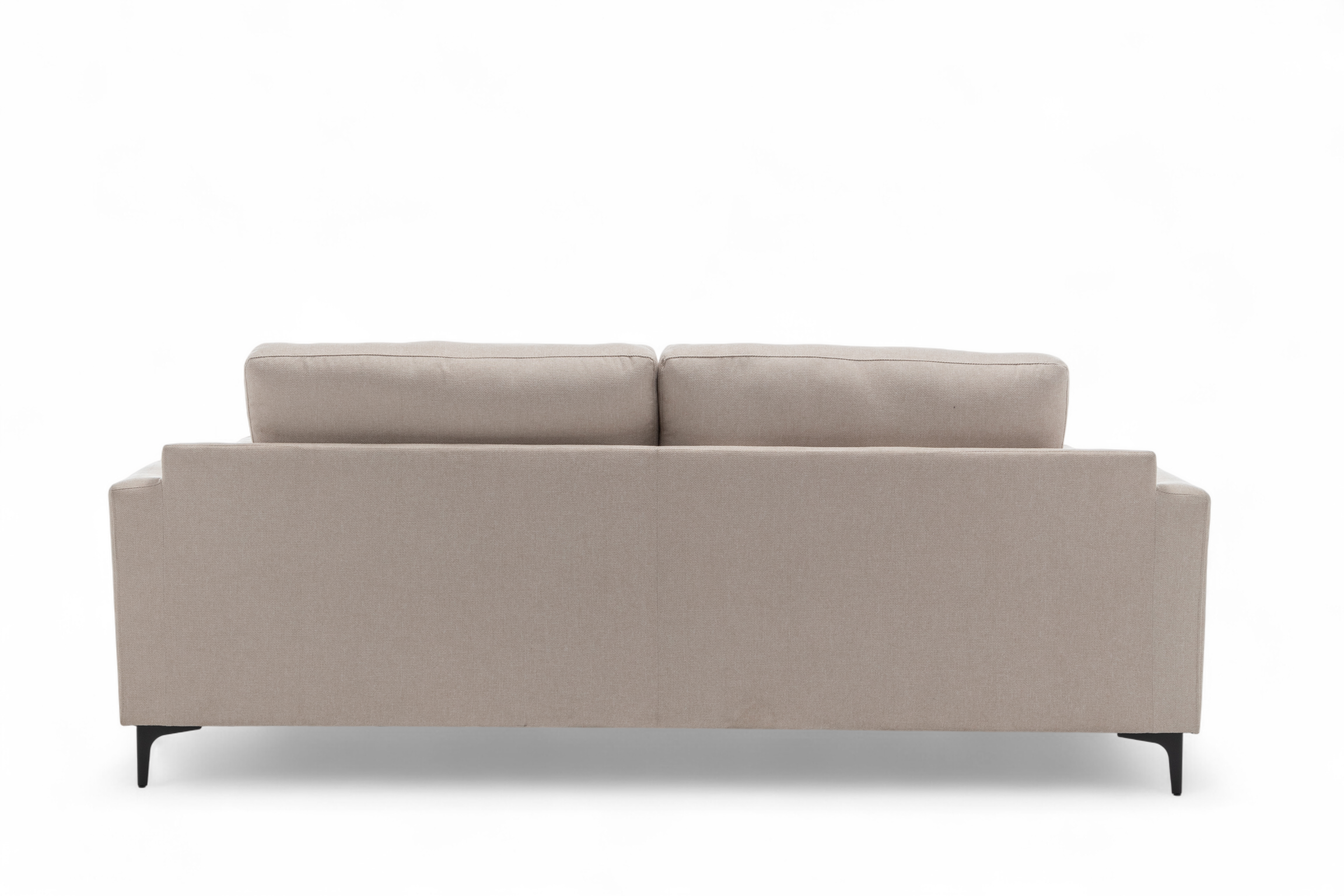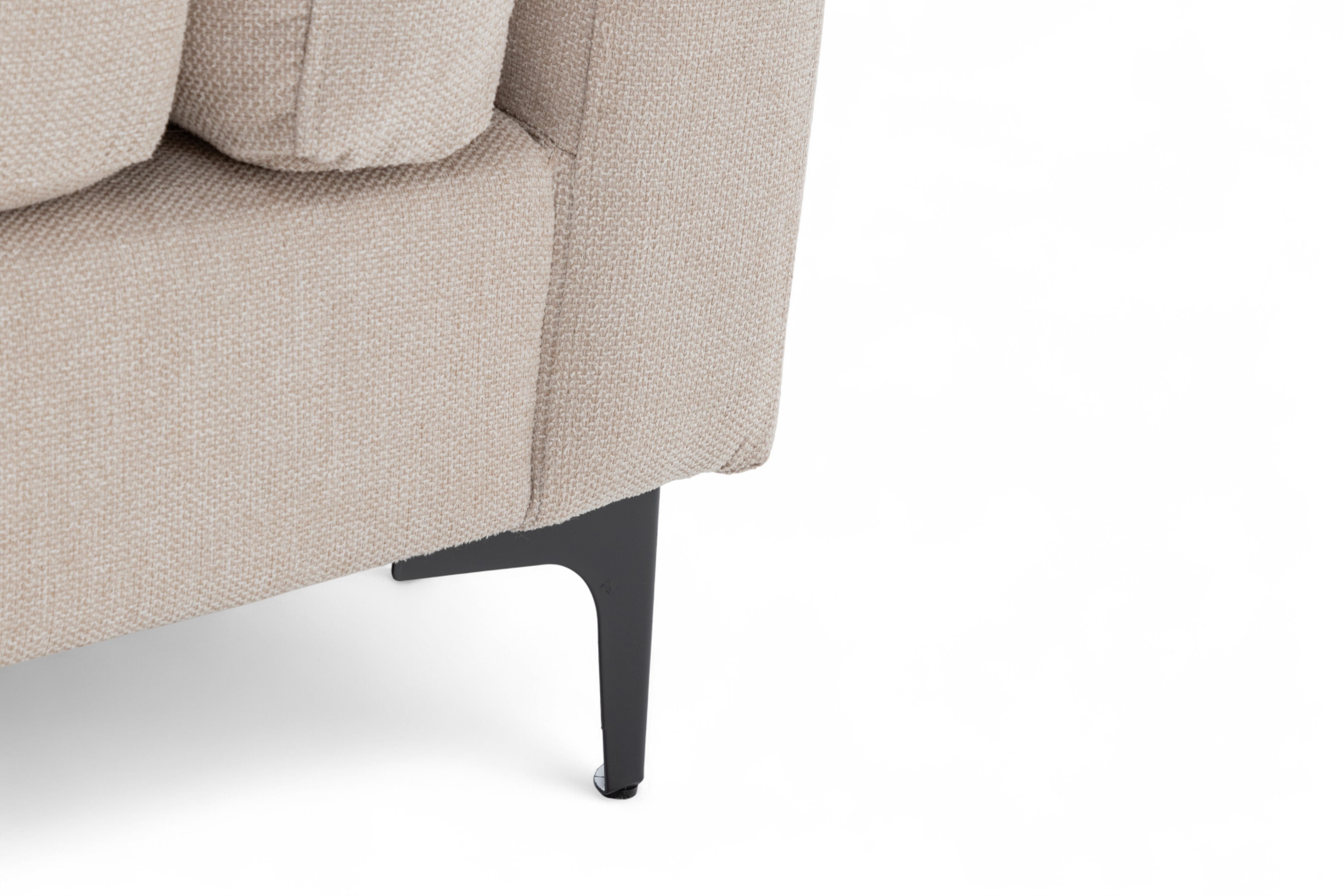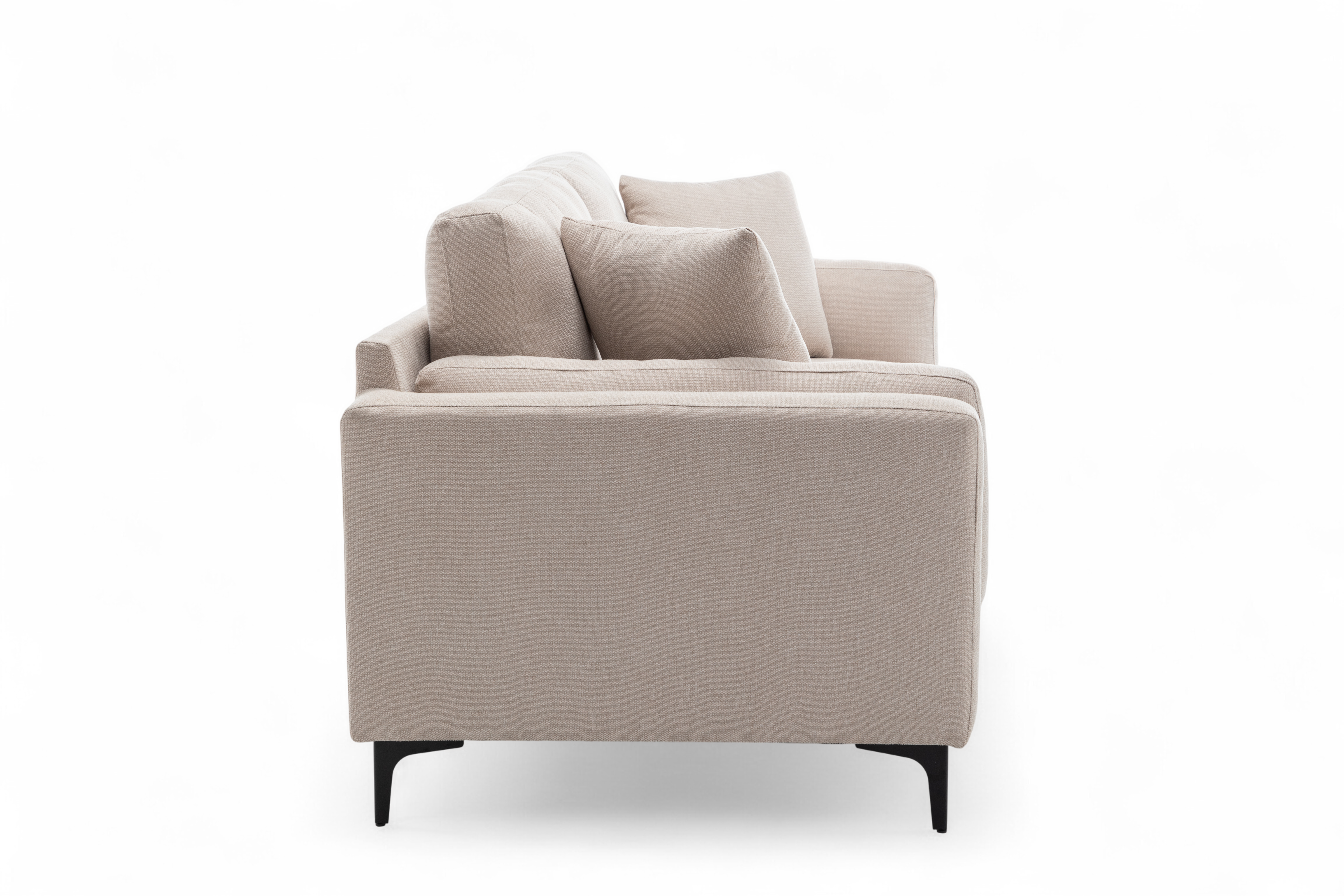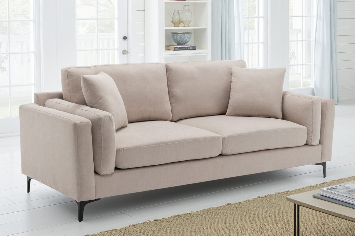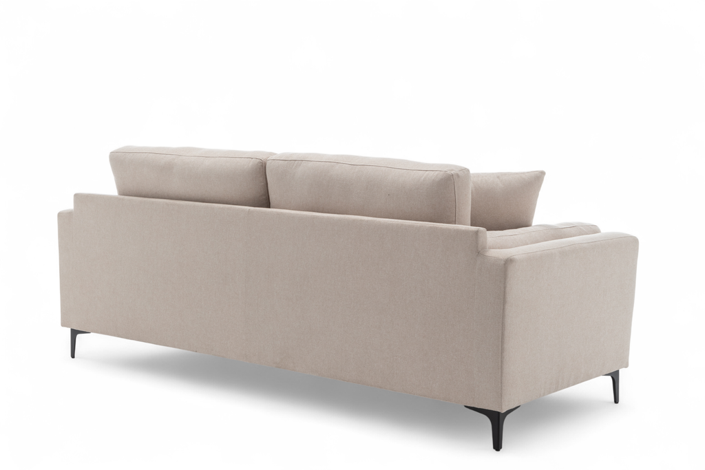The Marghera is an elegant, contemporary-style sofa upholstered in beige fabric. It is built on a hardwood frame, with pocket-sprung medium density foam-filled seats. Alongside the fixed backrest cushions, it comes with matching accent cushions and side cushions. The black angled feet add to the modern silhouette of this sofa. This 3 seater variant is quite compact and perfect for a variety of spaces, whether used on its own or as part of a bigger ensemble.