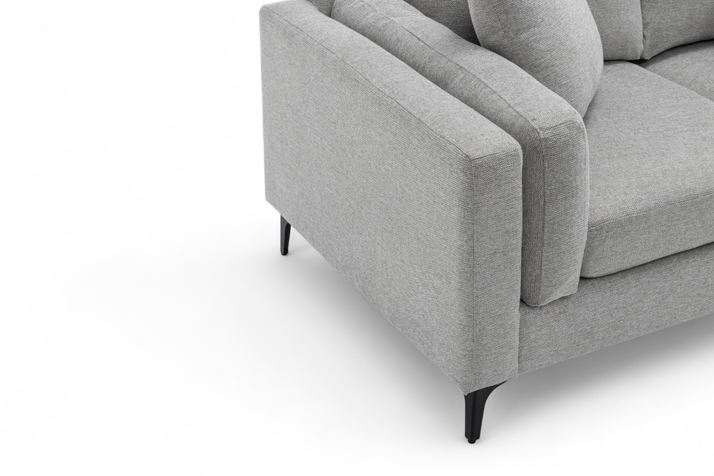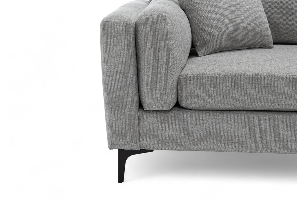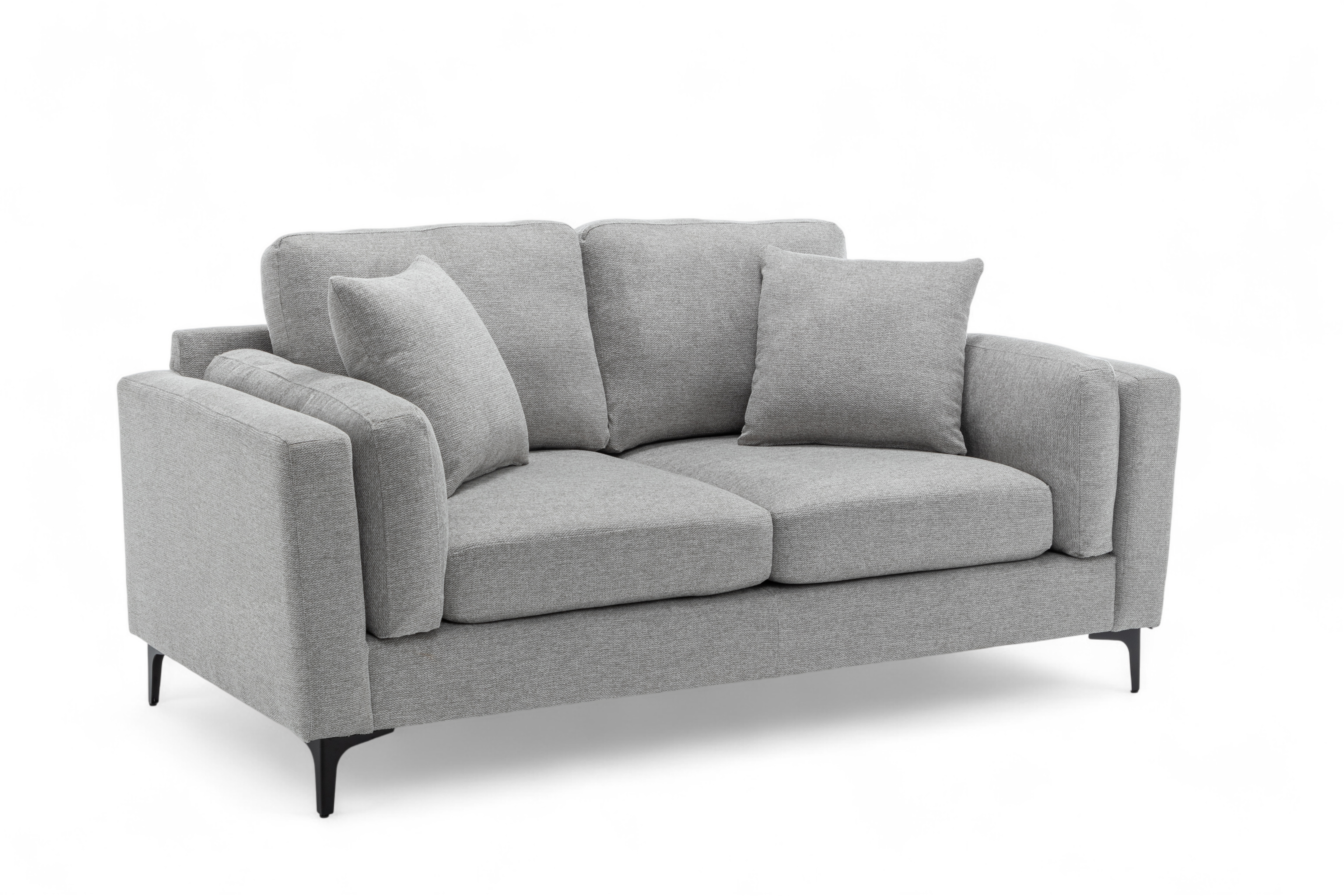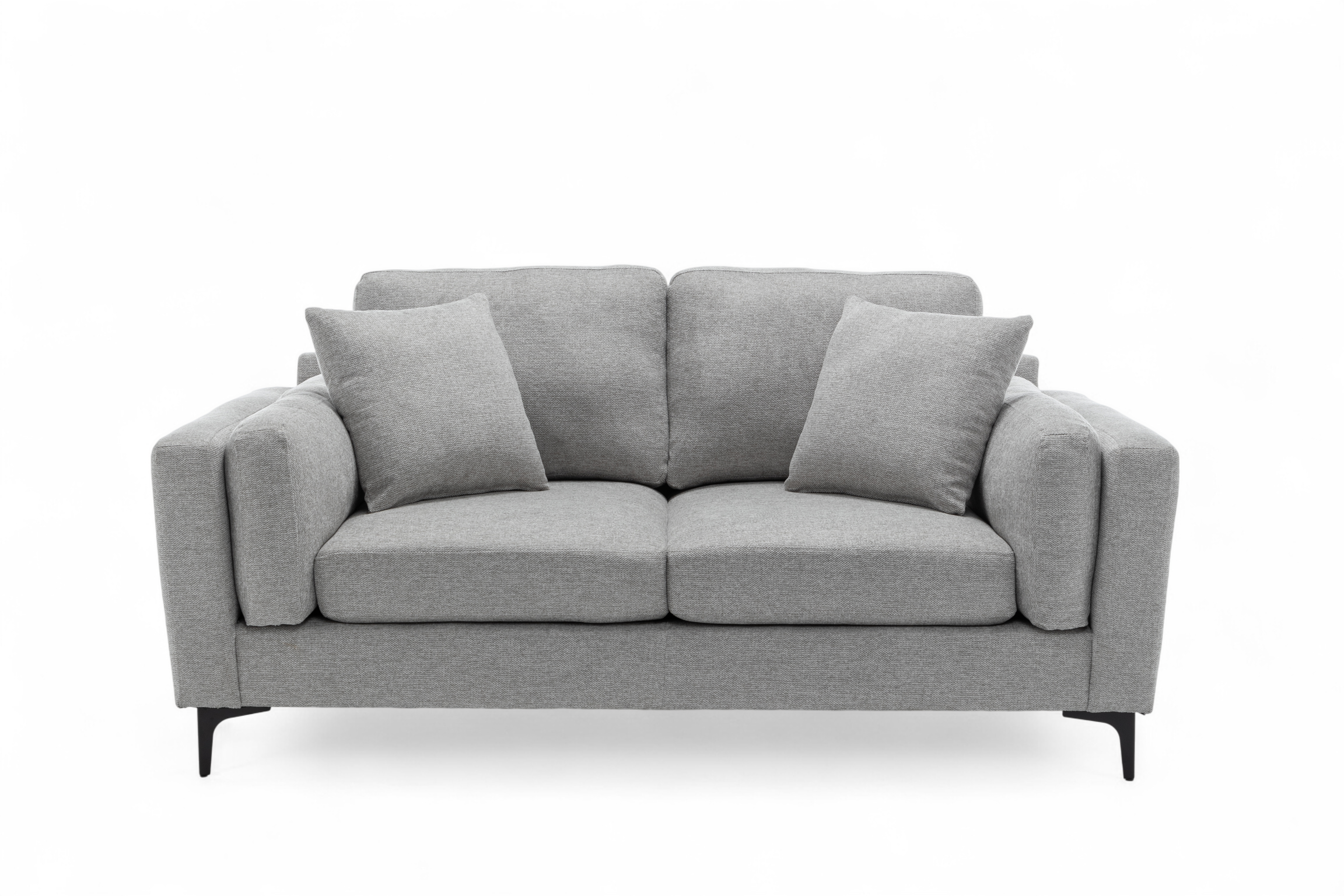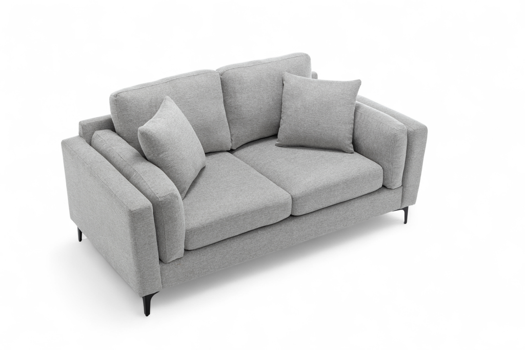 The Marghera is an elegant, contemporary-style sofa upholstered in light grey fabric. It is built on a hardwood frame, with pocket-sprung medium density foam-filled seats. Alongside the fixed backrest cushions, it comes with matching accent cushions and side cushions. The black angled feet add to the modern silhouette of this sofa. This 2 seater variant is quite compact and perfect for smaller spaces, as well as a part of a bigger set.