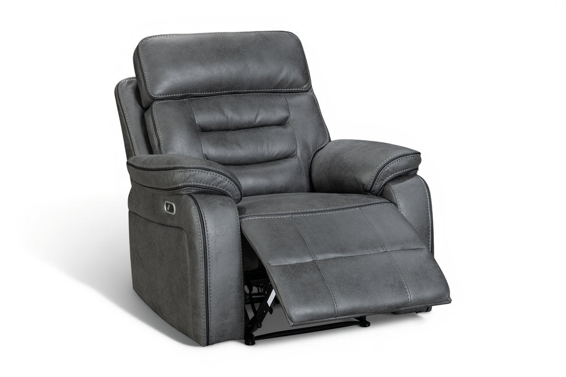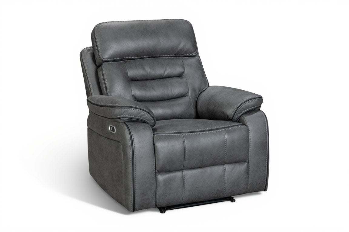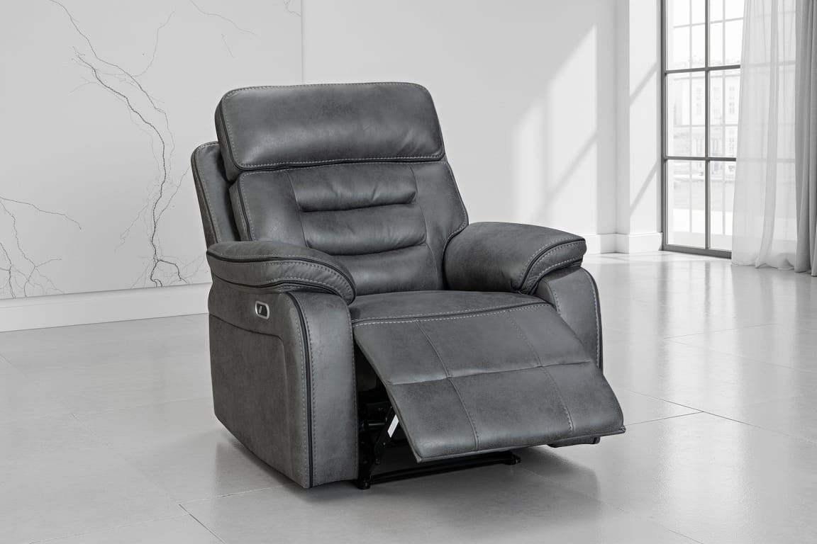 Relax in comfort and style with this power recliner chair, made to modernise your living room. The chair features a button-operated electric reclining mechanism that controls the backrest and the footrest. The faux leather upholstery in grey offers styling versatility and longevity, and the modern silhouette prioritises comfort with the in-built lumbar support and a cushioned headrest. The seating is filled with medium-density foam to ensure top-tier comfort. The button panel includes an USB charging port. Ideal for movie nights, cosy evenings, and everyday use.