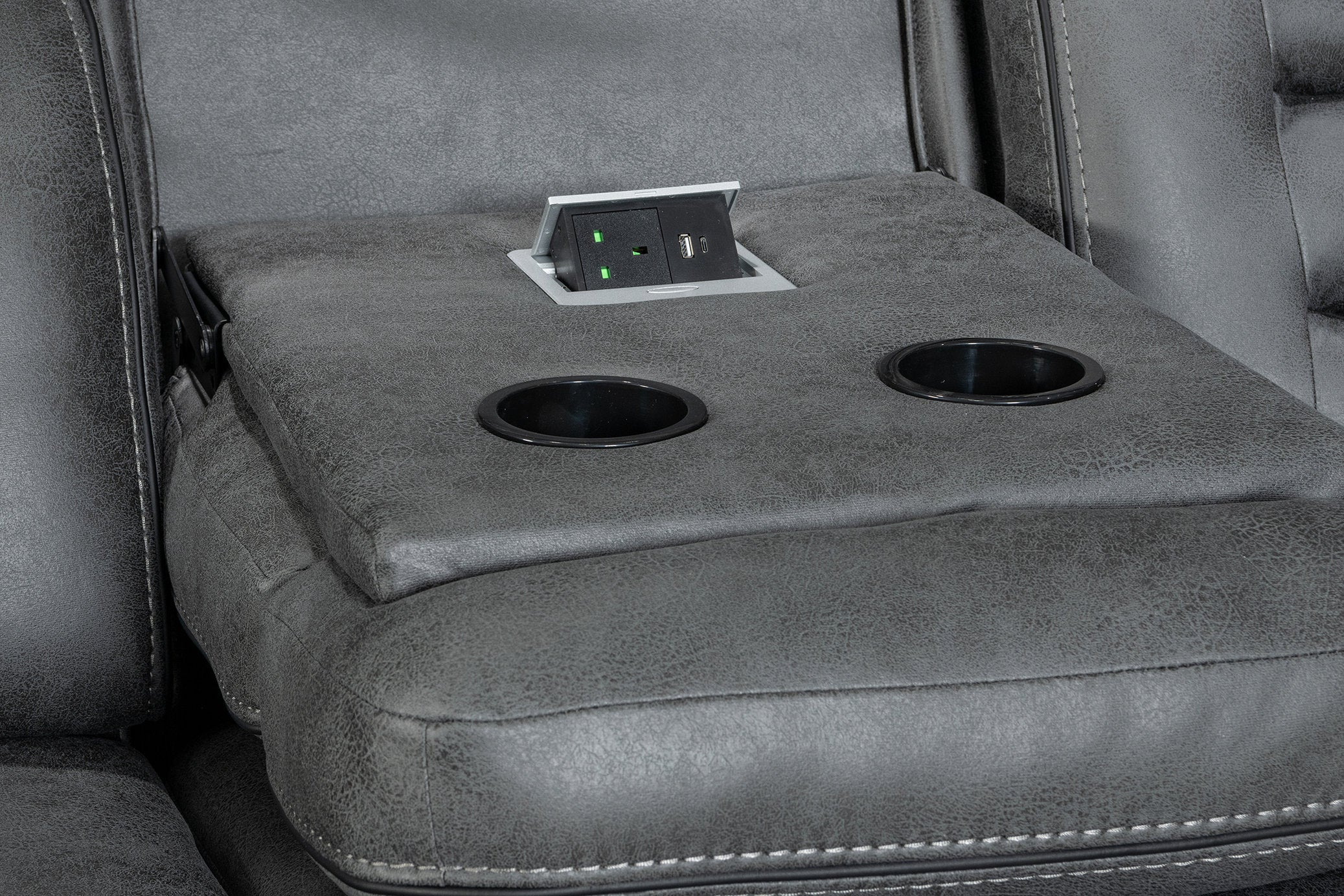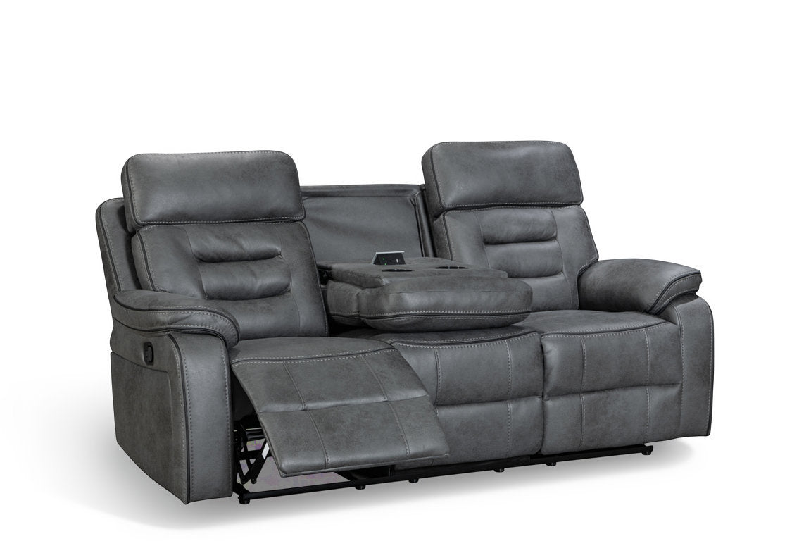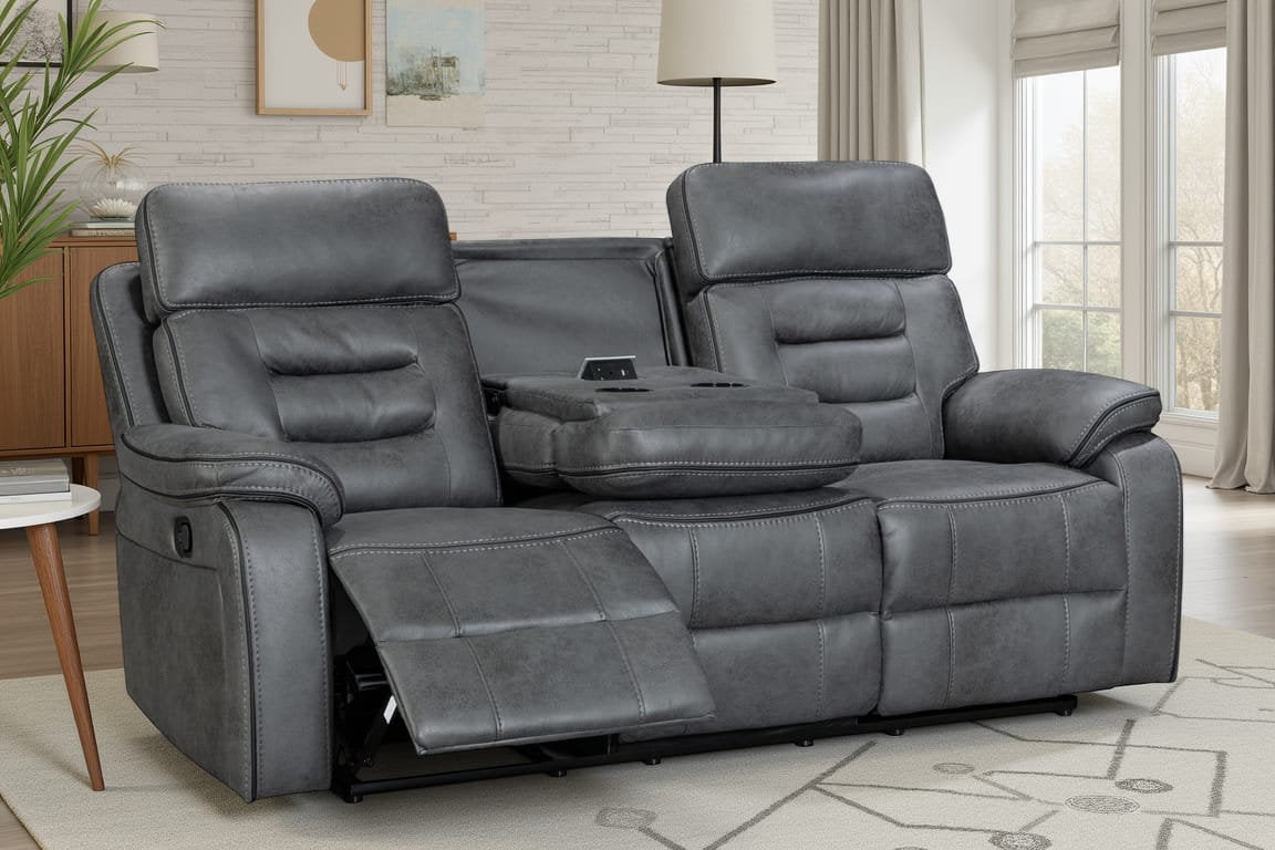 Relax in comfort and style with this 3 seater manual recliner sofa, made to modernise your living room. The Venetian 3 seater recliner sofa features an easy to use lever-operated manual reclining mechanism that controls the backrest and the footrest. The faux leather upholstery in grey offers styling versatility and longevity, and the modern silhouette prioritises comfort with the in-built lumbar support and a cushioned headrests. The seating is filled with medium-density foam to ensure top-tier comfort. The middle seat pulls down to reveal a console with cupholders and a pop-up power module with USB ports and a power socket. Ideal for movie nights, cosy evenings, and everyday use.