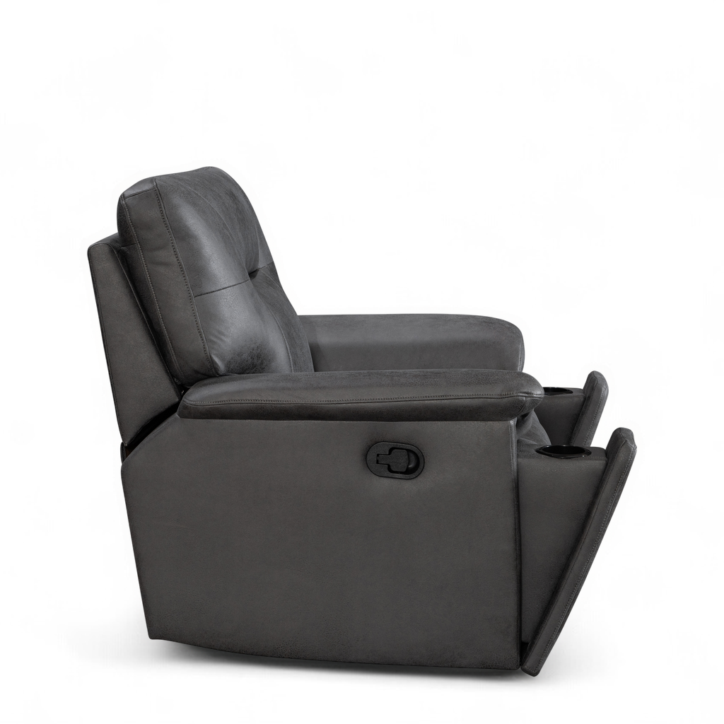 The Murcia range offers everything you need to rest and catch a break. The manual reclining functionality allows you to adjust to your preferred position, including the footrest. The front armrest sections pull out to reveal convenient cup holders. The classic recliner design and the grey faux leather upholstery offer versatility in adding it to existing decor and modern interiors. The backrest and armrests are well-padded for optimal comfort during your leisure time.