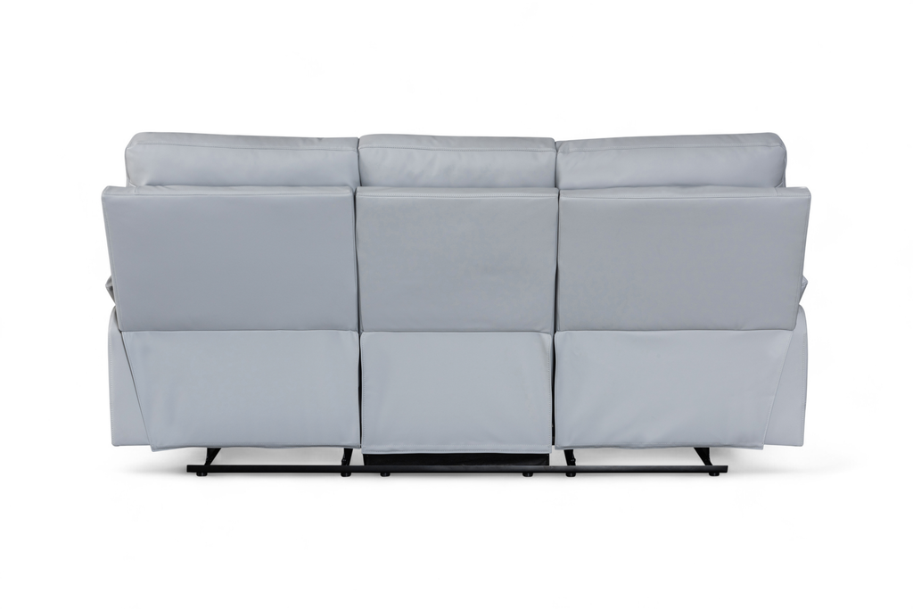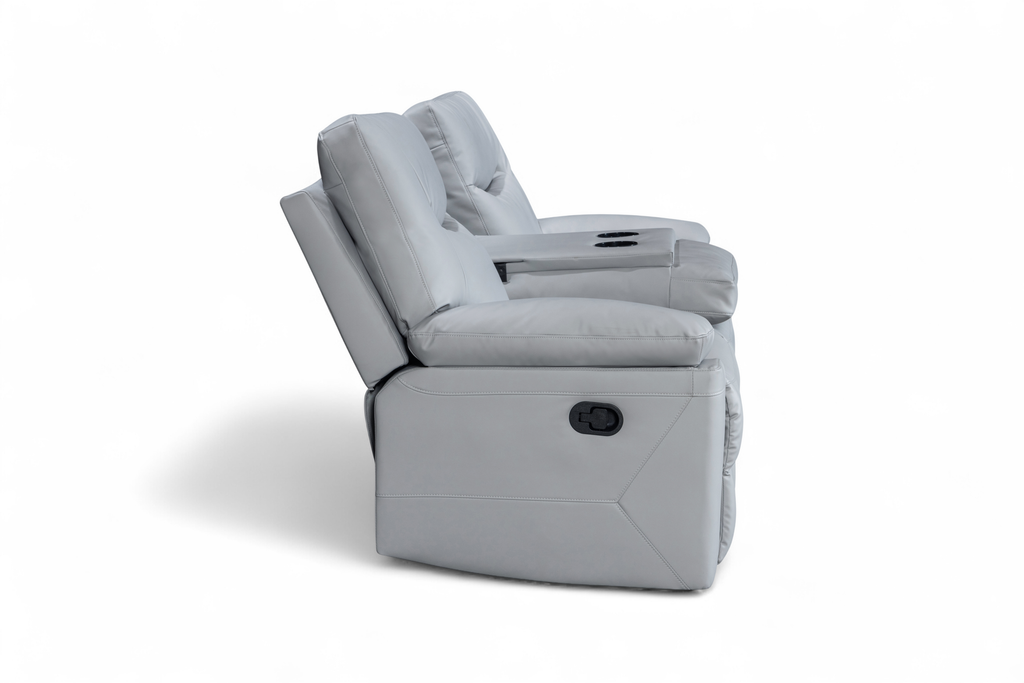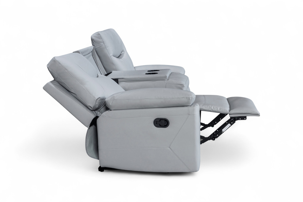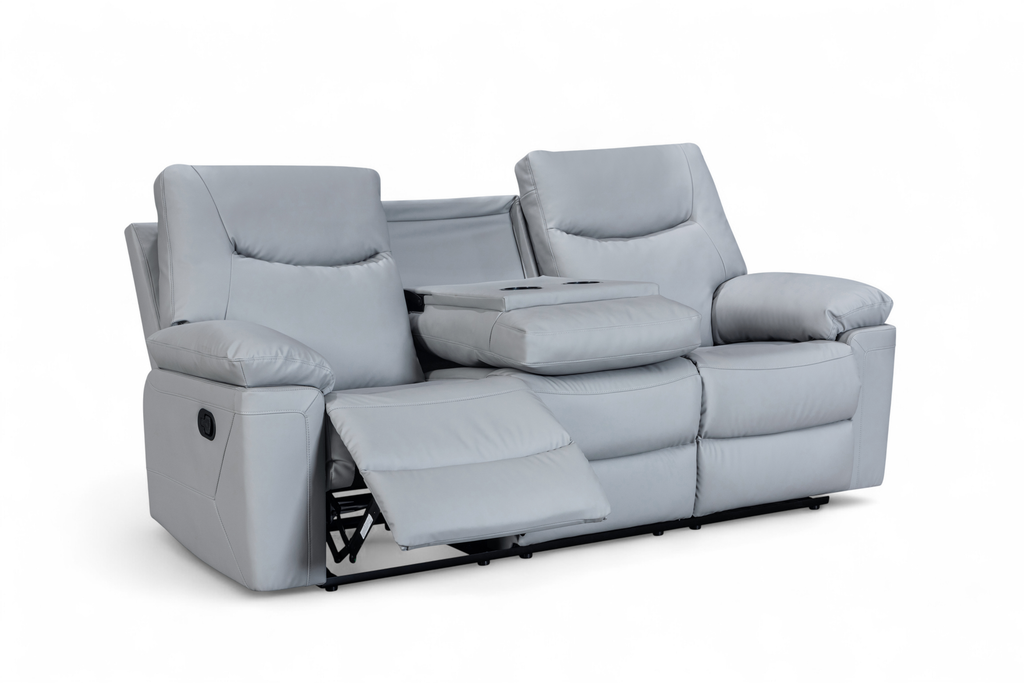 The Columbia 3 Seater Recliner Sofa is upholstered in light grey faux leather with a smooth, matte finish. The design is clean and modern, with gently curved lines and subtle stitching detail. Each seat includes a manual lever-operated recline function, allowing you to lean back and put your feet up to unwind. The middle backrest can be dropped to reveal a console with cupholders. The padding is generously filled for everyday comfort, with soft armrests and plush back cushions designed to support. A practical choice for smaller rooms or paired with other pieces from this range.