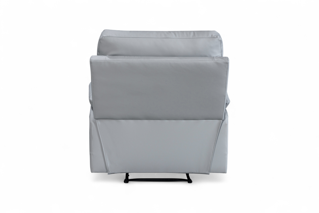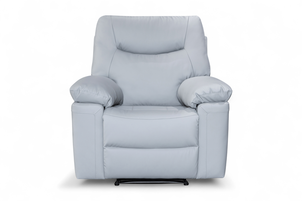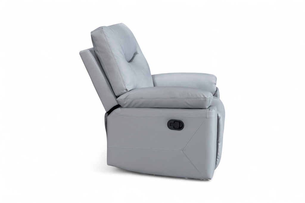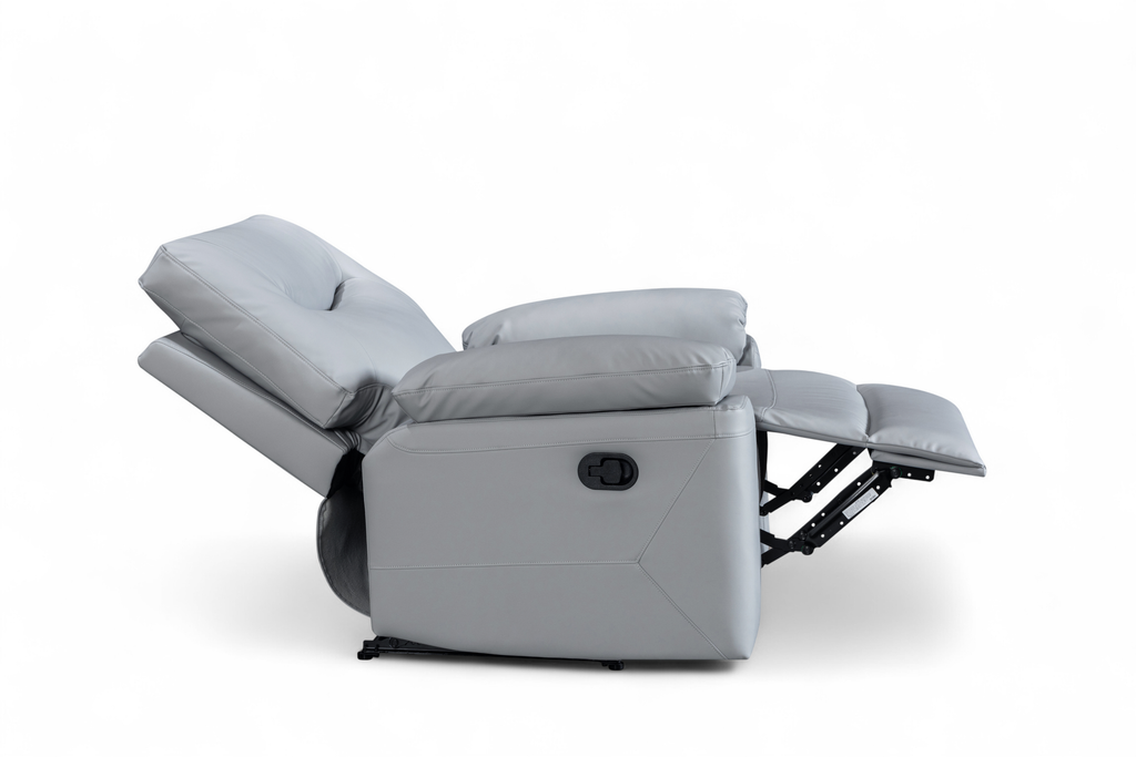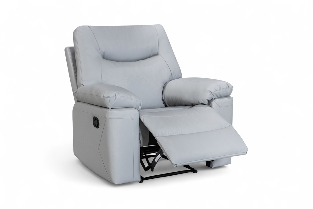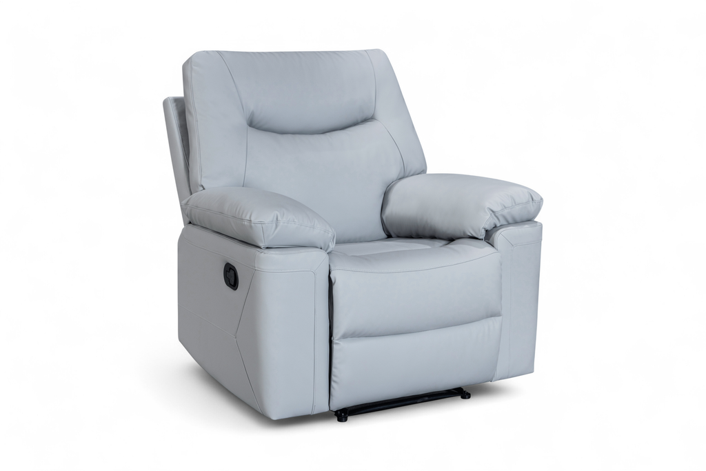 The Columbia Recliner Chair is upholstered in light grey faux leather with a smooth, matte finish. The design is clean and modern, with gently curved lines and subtle stitching detail. It features a manual lever-operated recline function, allowing you to lean back and put your feet up to unwind. The padding is generously filled for everyday comfort, with soft armrests and plush back cushions designed to support. A practical choice for smaller rooms or paired with other pieces from this range.