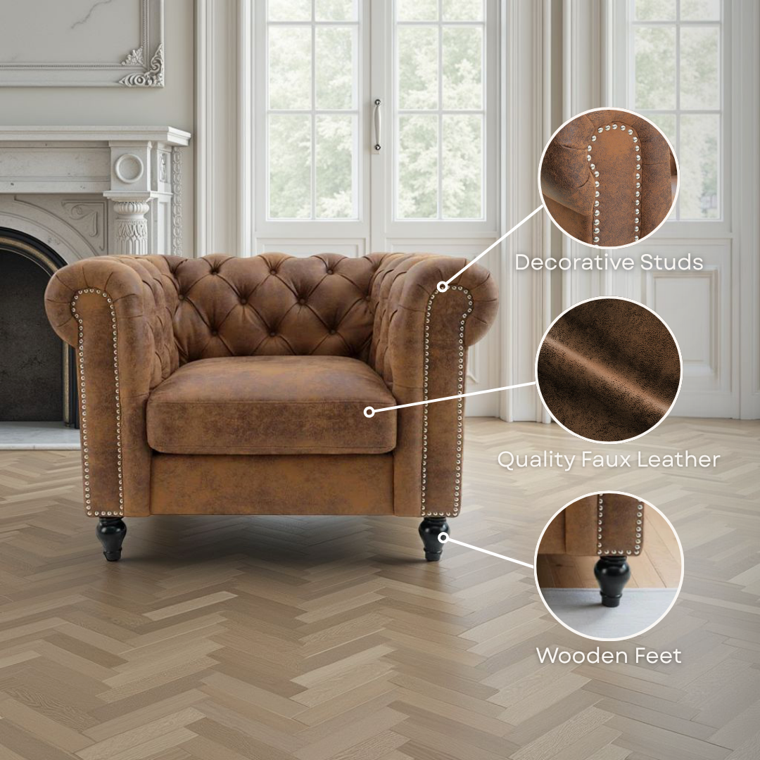 Faux Leather Suede Brown 1 Seater Chesterfield Sofa With Wooden Feet CAMDEN