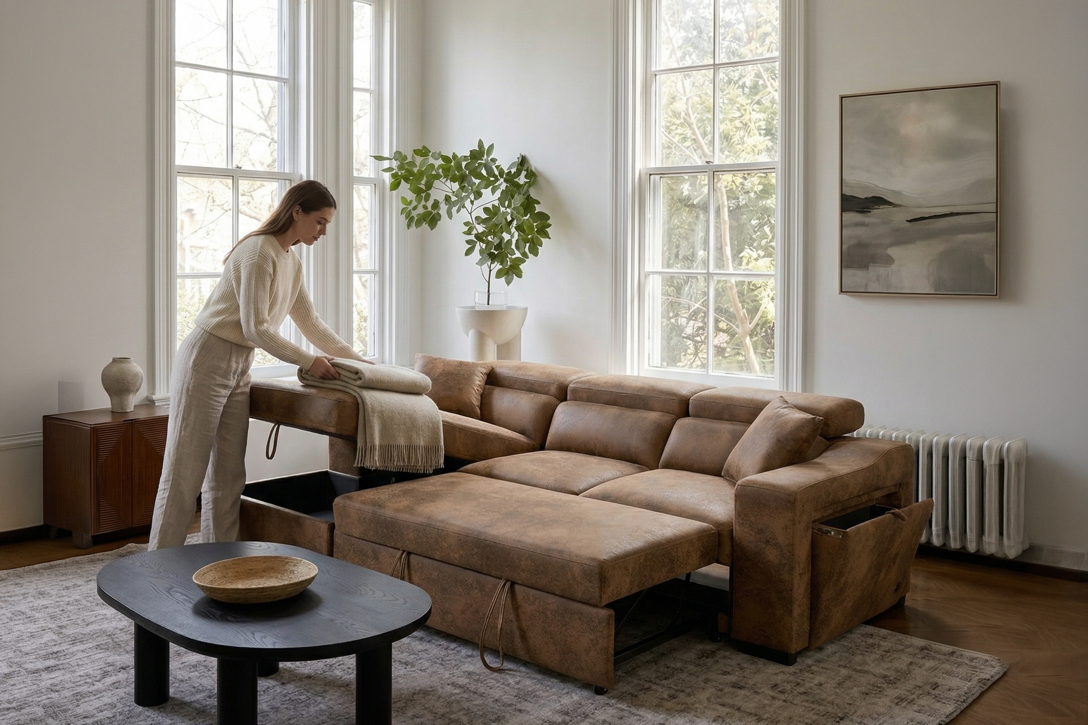 One side panel flips open to reveal a small compartment with a cupholder and wireless phone charger built in. Ideal for lounging, storing, or sleeping, the Arthur Corner Sofabed makes the most of the space it takes up.