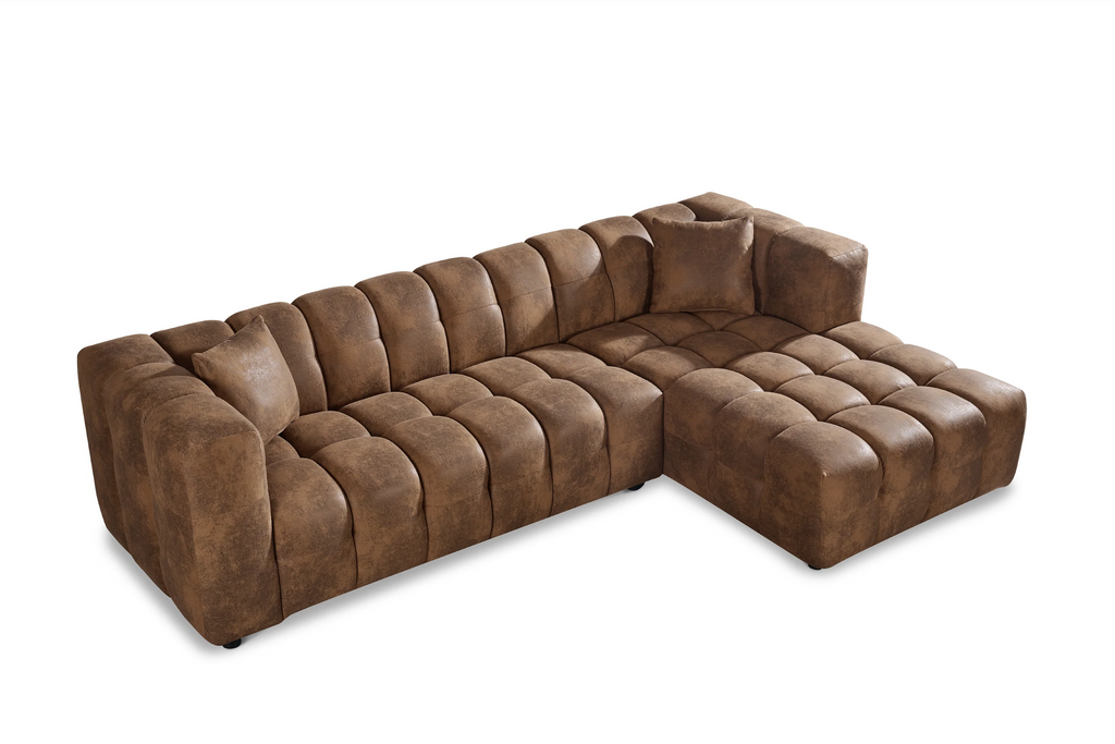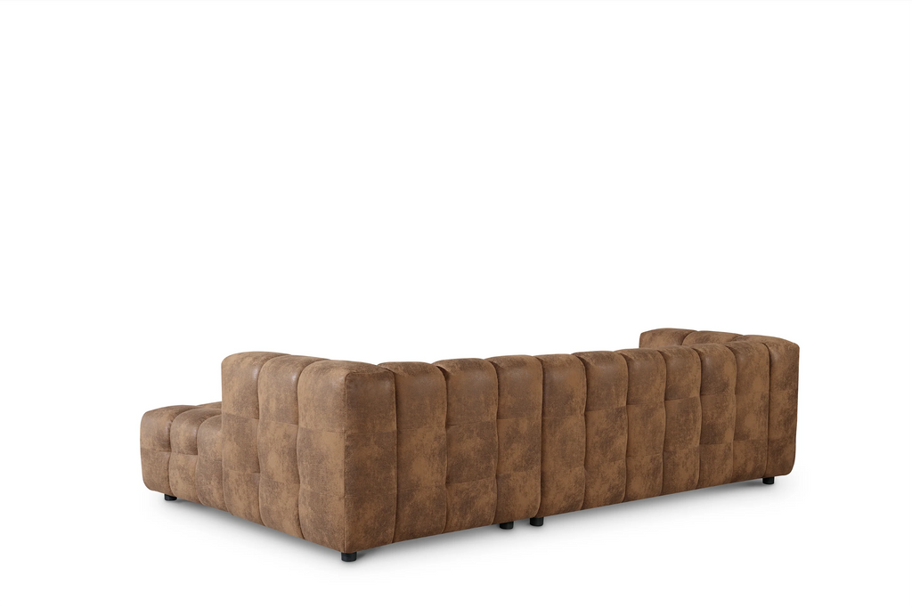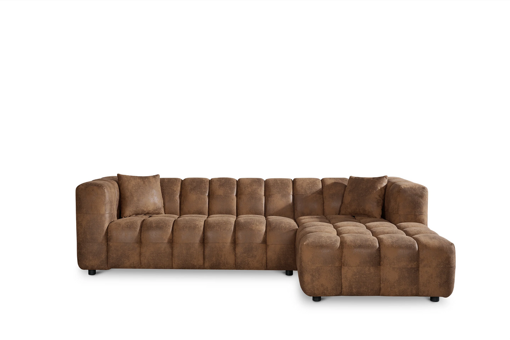 The Lugano Corner Sofa exemplifies modern design with its low profile silhouette and unique blocky structure. Ideal for modern spaces in need of a glamorous centrepiece. The Lugano range is built on a sturdy hardwood frame, with sprung seats filled with dense foam. This, with addition of a chaise end section, makes the Lugano Corner Sofa the perfect pick for daily use, providing both comfort and style. The upholstery showcases the unique suede-like finish on faux leather in brown, adding character and versatility; thanks to this upholstery, the Lugano Corner Sofa will suit not only modern living rooms, but industrial and mid-century ones as well.