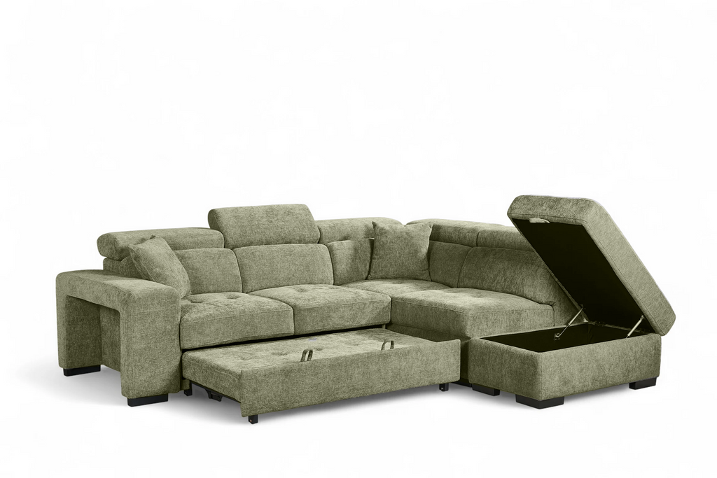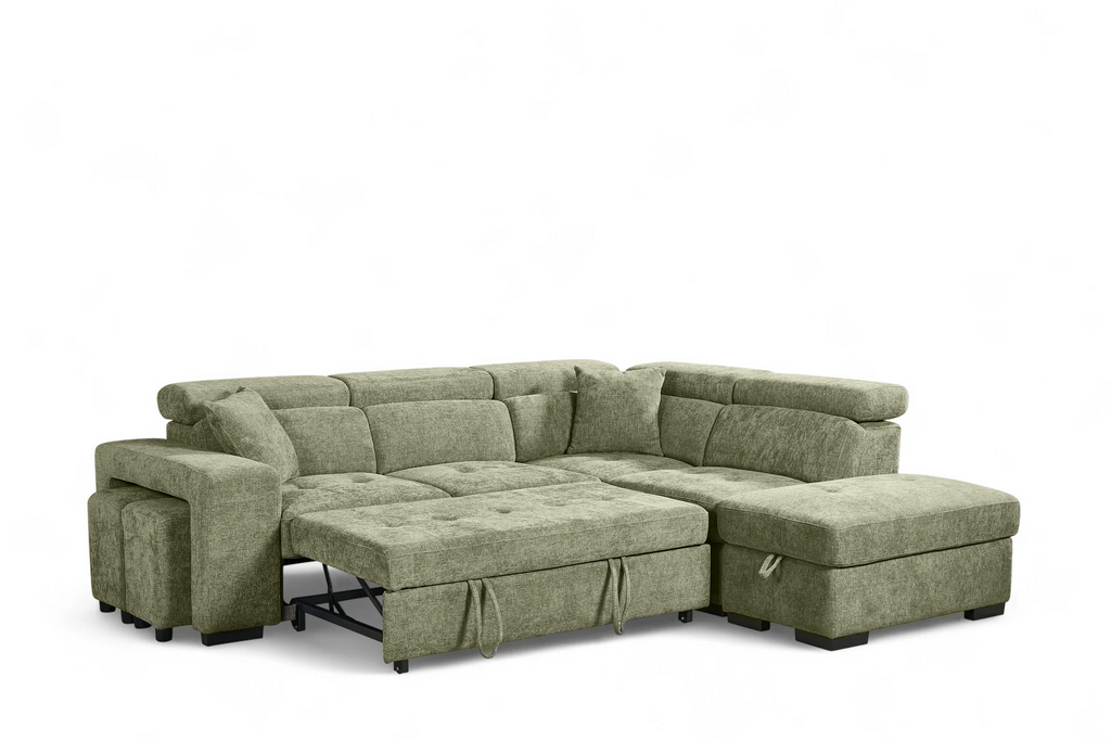 The Green Chenille Fabric Amelia Corner Sofabed is a multifunctional seating, sleeping, lounging, and storage solution. The L-shaped corner silhouette makes for a perfect living room seating, with the right hand facing side featuring a chaise end section for additional leisure option. The end piece of the chaise section opens up to reveal storage space. The main section pulls out to convert this piece into a sofabed. Suitable for guest rooms, additional sleeping option, or to maximise the use of your space. Additionally, there are two ottomans tucked into the left hand facing end of the sofa, an additional utility. The headrests are adjustable to suit your preferences.
