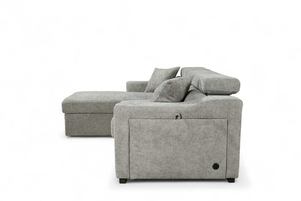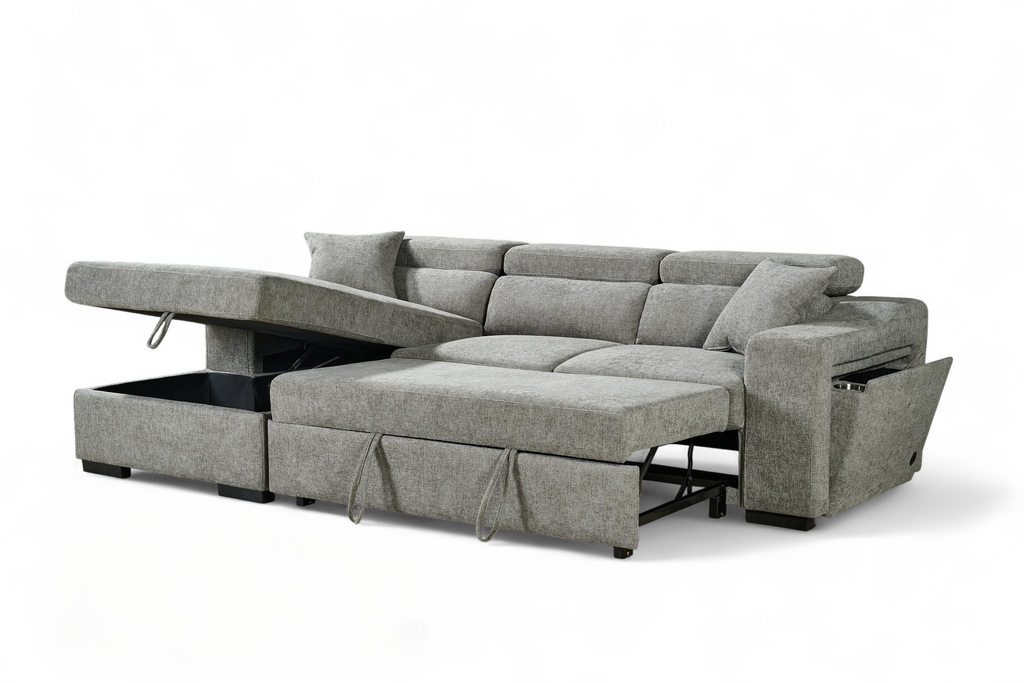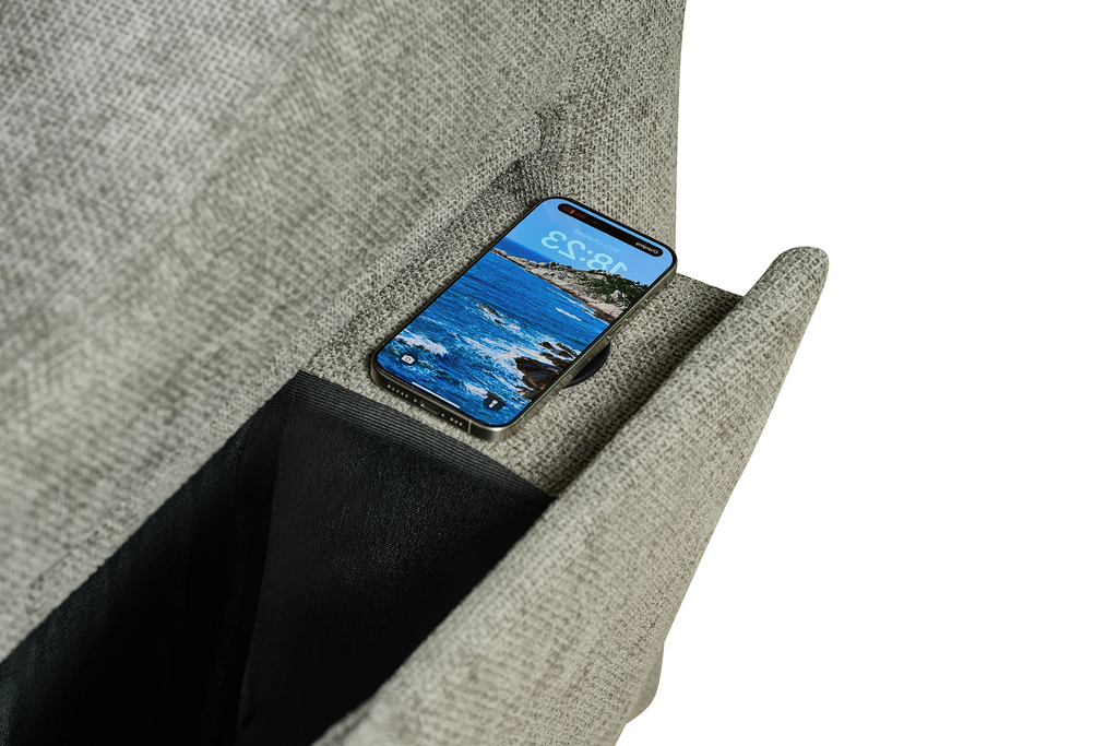 One side panel flips open to reveal a small compartment with a cupholder and wireless phone charger built in. Ideal for lounging, storing, or sleeping, the Arthur Corner Sofabed makes the most of the space it takes up.