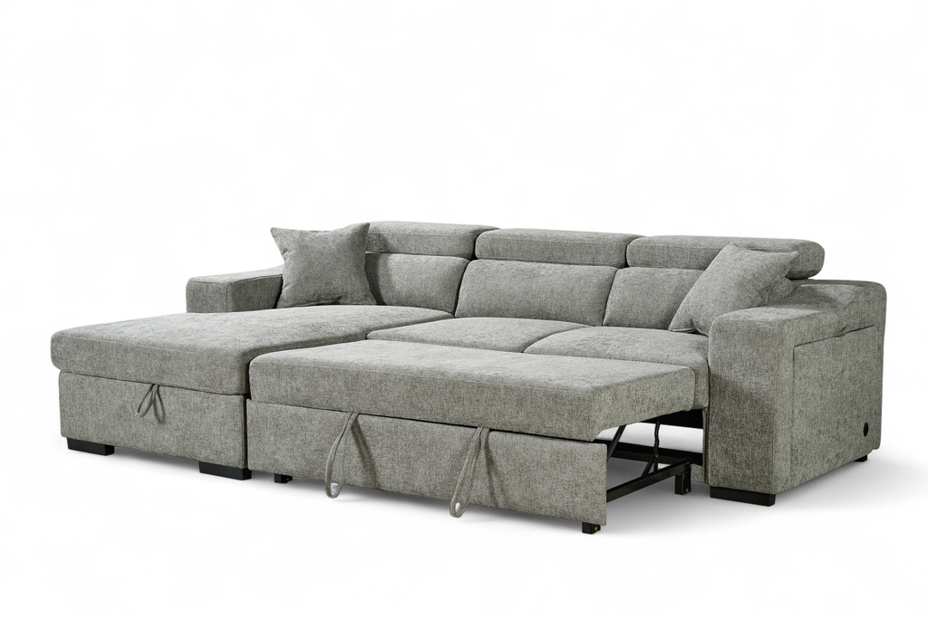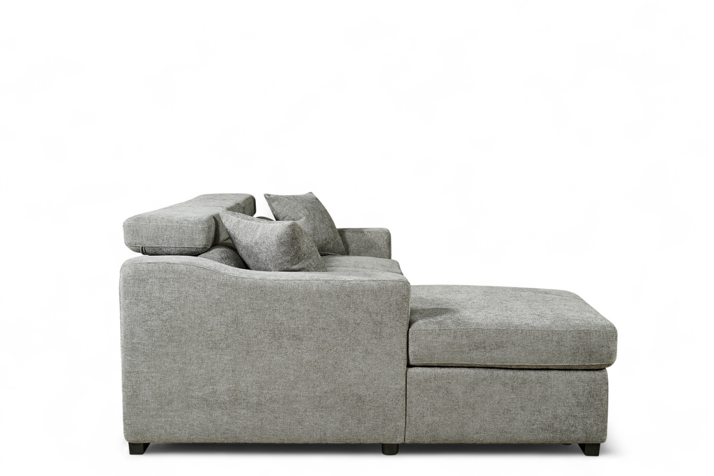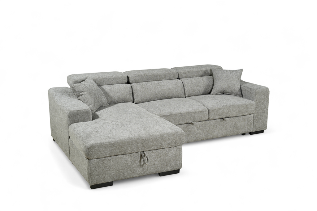 The Arthur 1C2 Corner Sofabed is a practical all-in-one design, upholstered in grey chenille fabric. It features medium-density seat cushions, adjustable headrests, and two matching scatter cushions. The chaise lifts to reveal a storage compartment for blankets or everyday clutter, and the seat base pulls out to create a double sofabed - useful for guests or extra sleeping space.