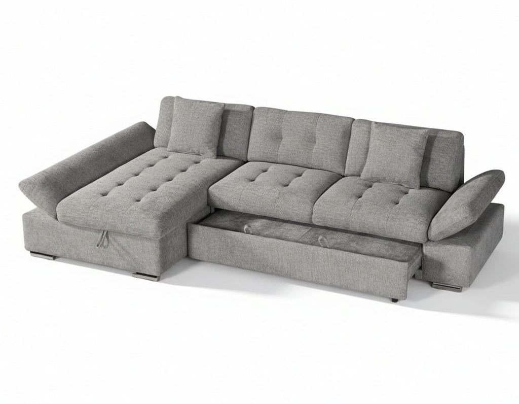 The Grey Chenille Fabric 1C2 Harry Corner Sofabed with Storage offers a practical setup for day-to-day use, with a pull-out sofabed section and a lift-up storage compartment built into the chaise. The cushions have a soft, textured chenille finish in a neutral grey tone, and the tufted seat detail keeps the overall look tidy and modern.