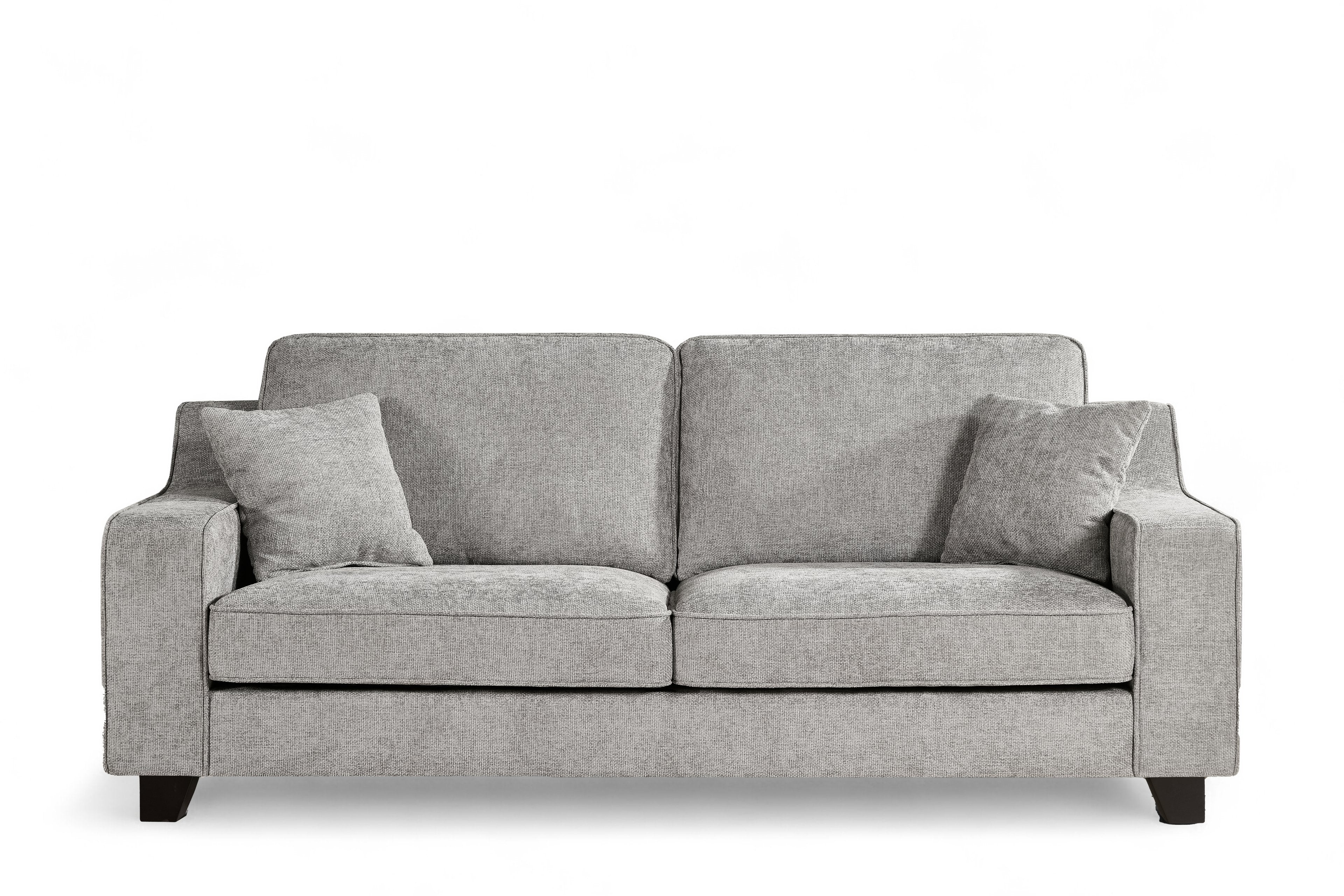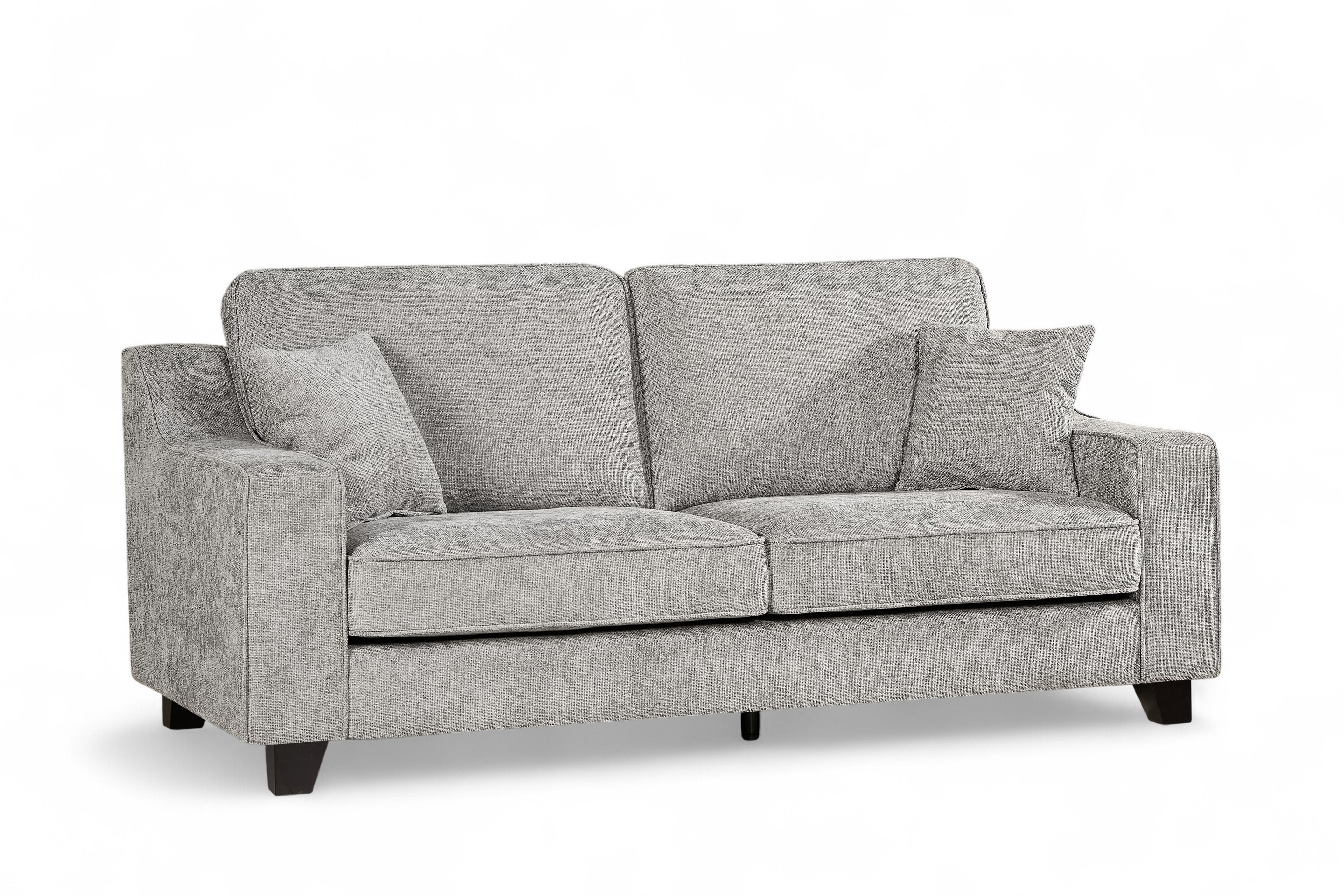 The Grey Chenille Fabric Nathan 3 Seater Sofa features a straightforward, modern shape with soft textured chenille upholstery in a neutral grey shade. Its fixed back cushions and well-padded seats offer comfortable everyday seating, and the straight arms and dark tapered legs give the sofa a clean, balanced look. Two matching scatter cushions are included for added support and to finish the design neatly.