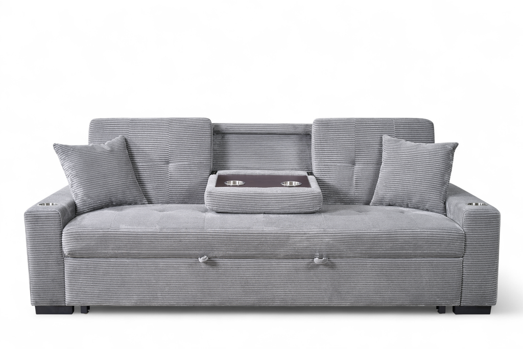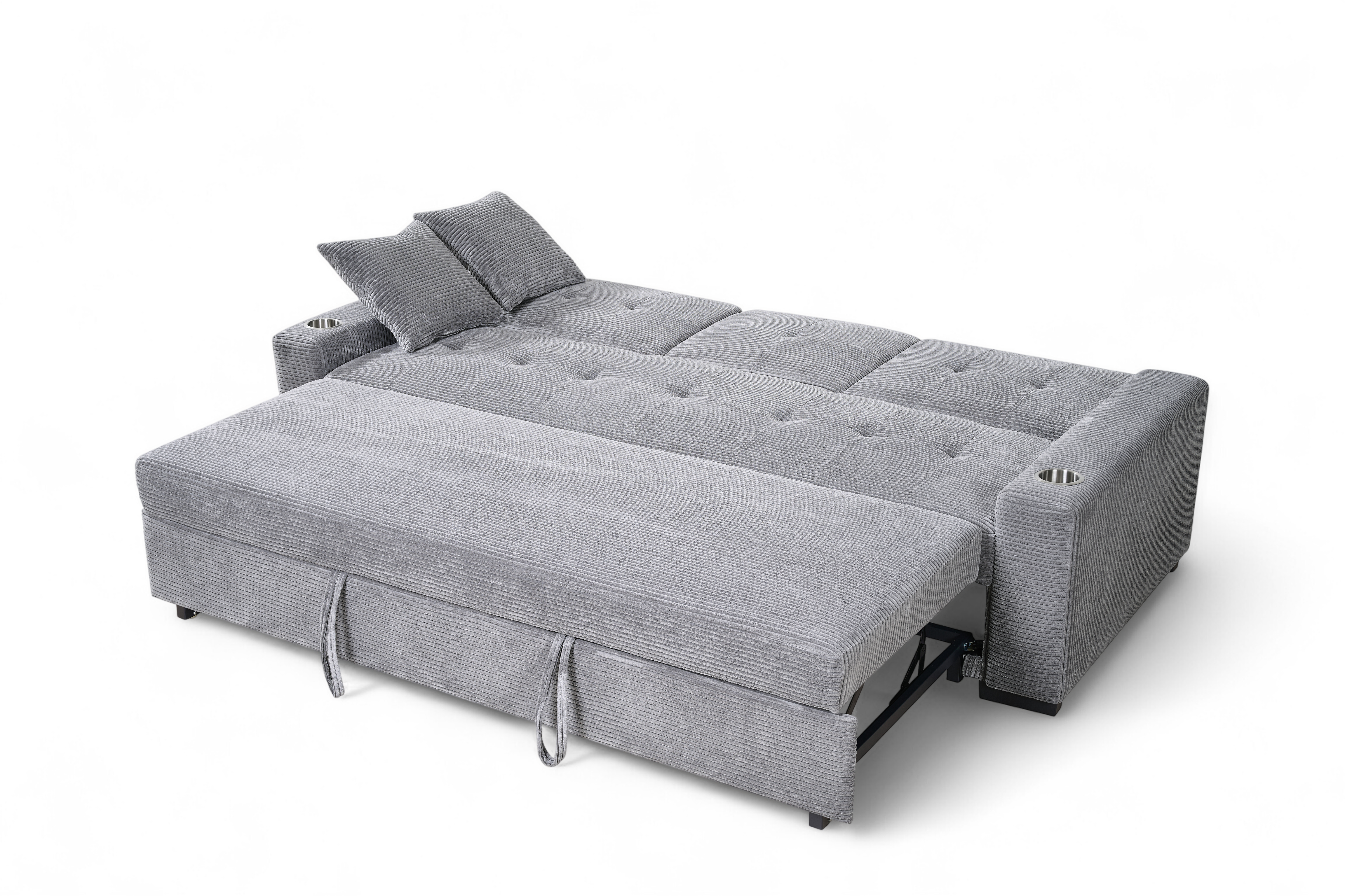 The centre backrest pulls forward to reveal a handy console, complete with integrated cupholders and a flat surface ideal for drinks or small items. Additional cupholders are built into the armrests, adding to the sofa’s functional design. Whether used as a classic sofa or pulled out as a guest bed, this piece is designed to fit into any contemporary home.