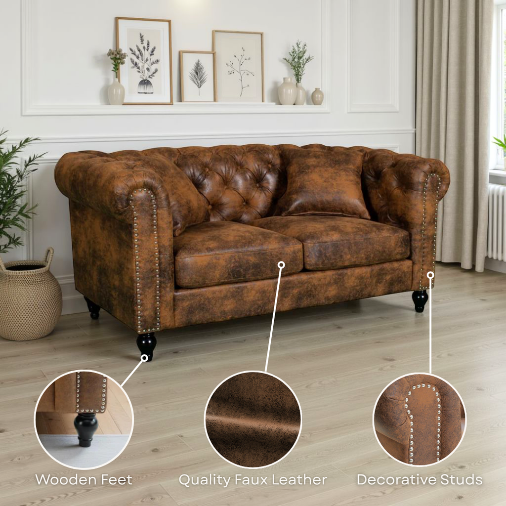 Faux Leather Suede Brown 2 Seater Chesterfield Sofa With Wooden Feet CAMDEN