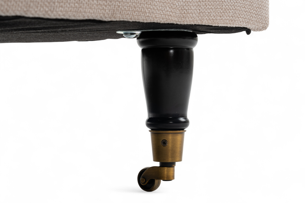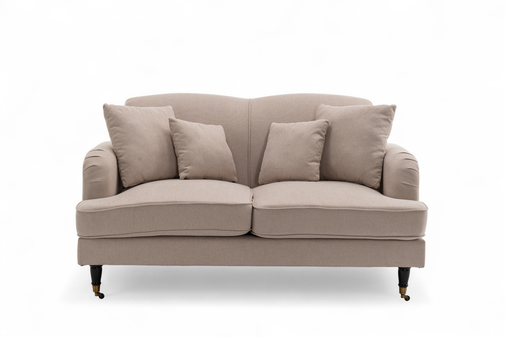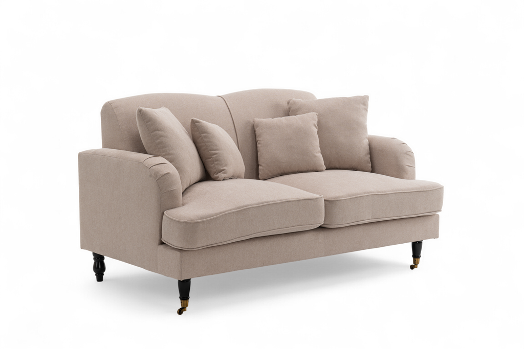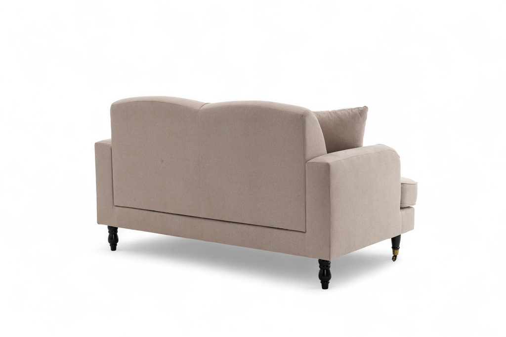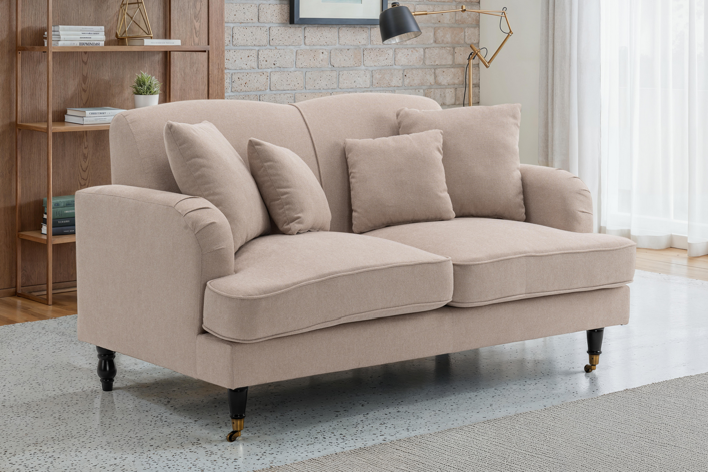 Perfectly suited for smaller places, the Fabric Beige 2 Seater Ashton Sofa maximises seating options without compromising on comfort or style. Its metal castors in the front and wooden legs not only add an attractive accent but also provide stability and durability. Crafted on a wooden frame, this sofa ensures long-lasting use for years to come.