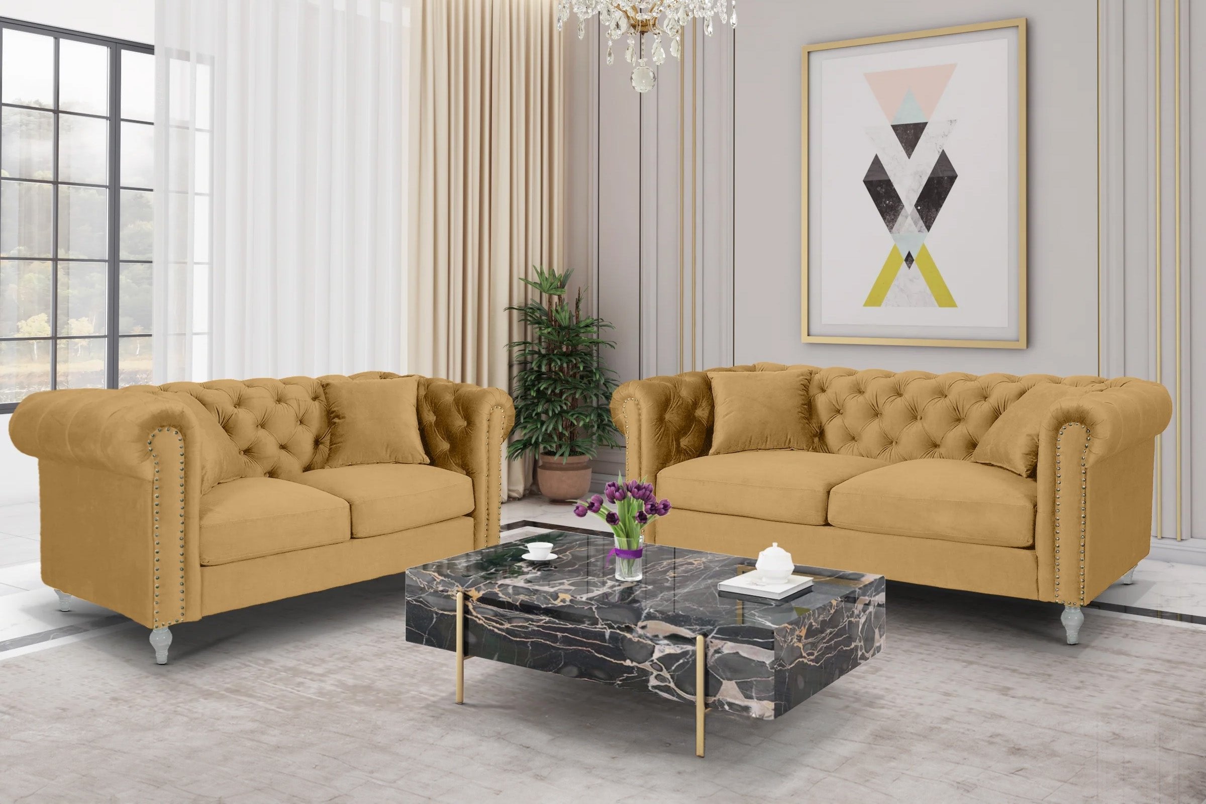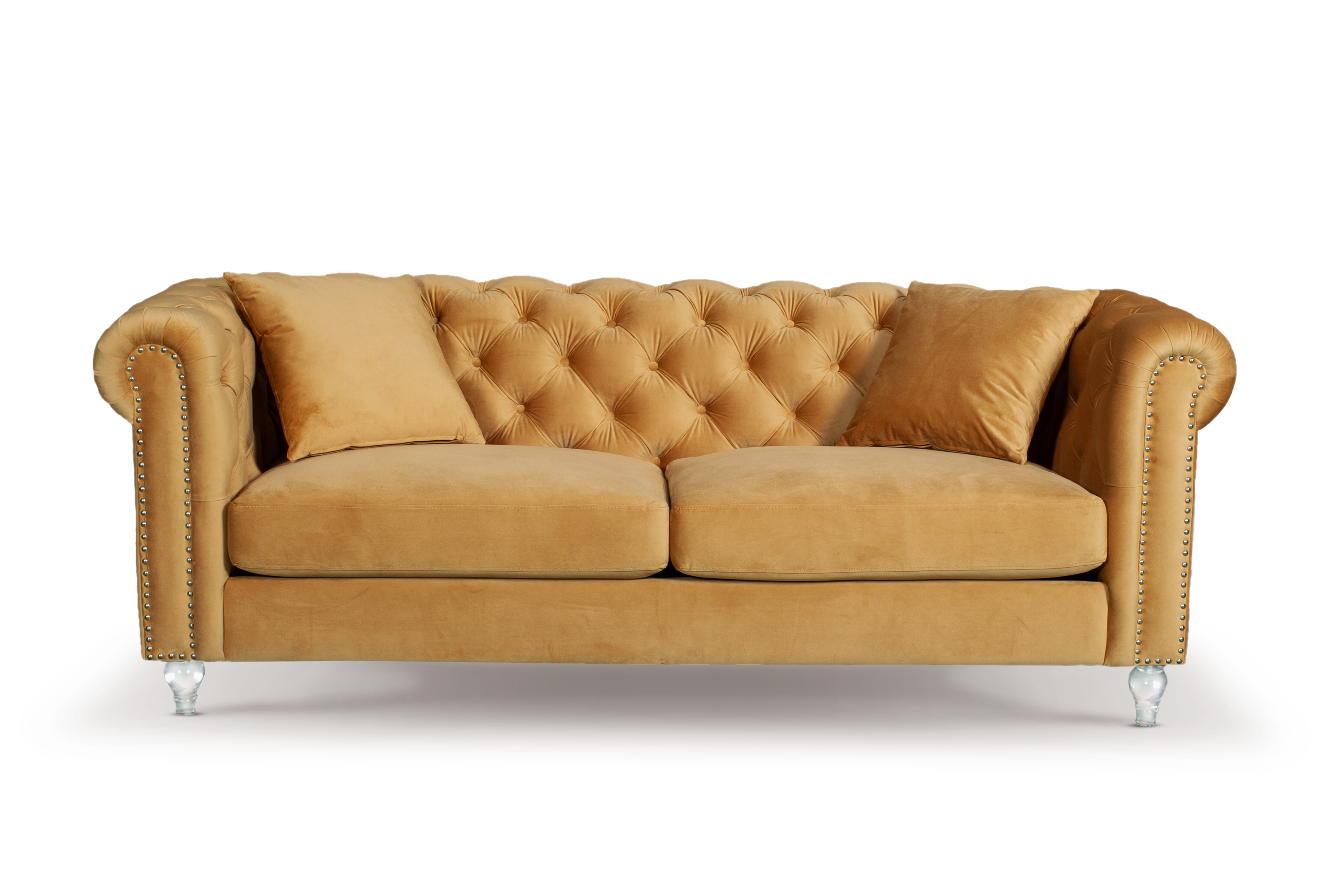 The Velvet Gold 3+2 Seater Camden Sofa Set with Acrylic Feet is a beautiful and stylish addition to your living room. Upholstered in polyester velvet fabric, these sofas display a smooth sheen that adds a touch of elegance. The sofas feature a classic Chesterfield design, with a modern twist thanks to their contemporary features. The Chesterfield silhouette offers elegant scroll arms adorned with decorative studs and deep buttoning on the backrest sections, offering a touch of sophistication to any room they are in.