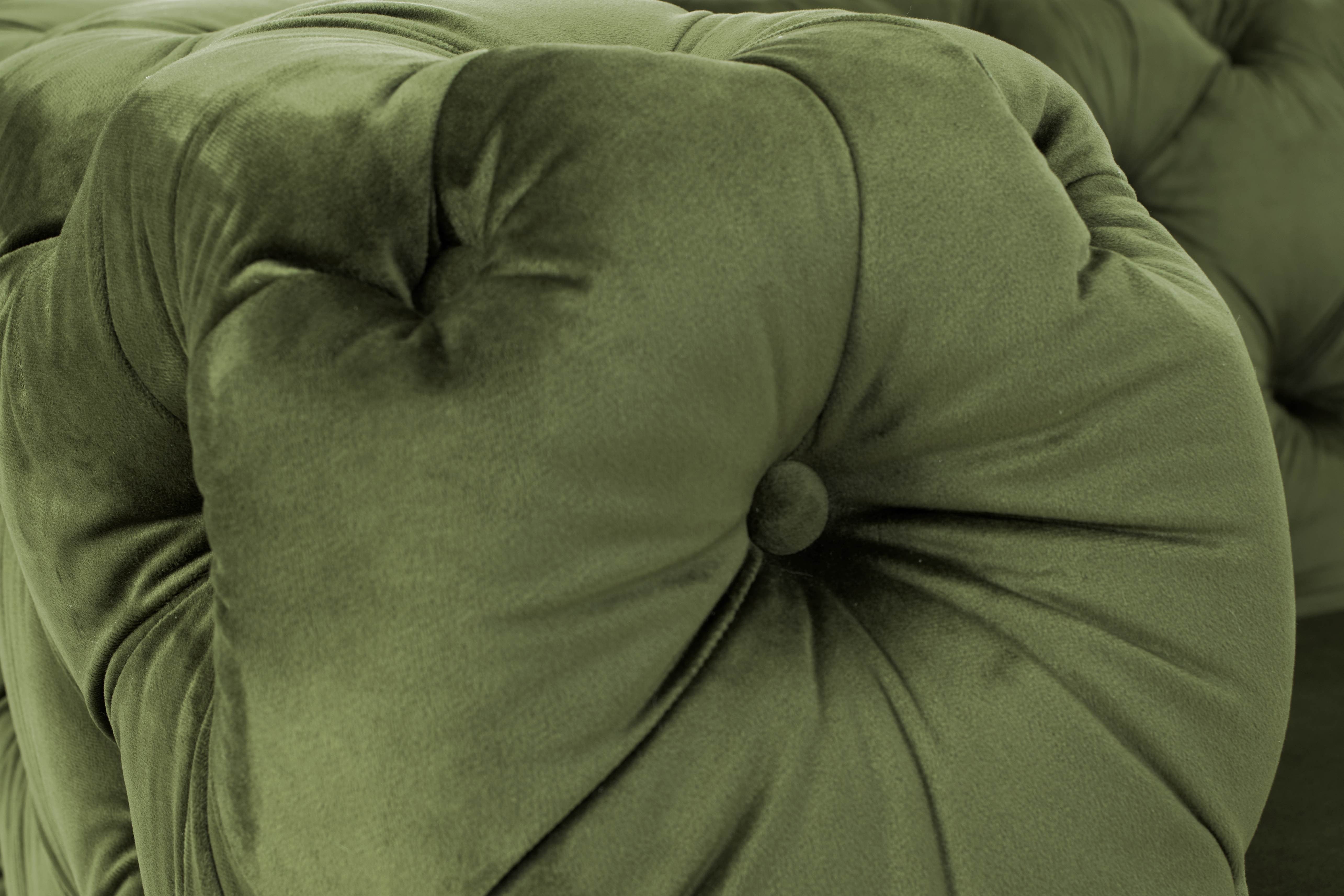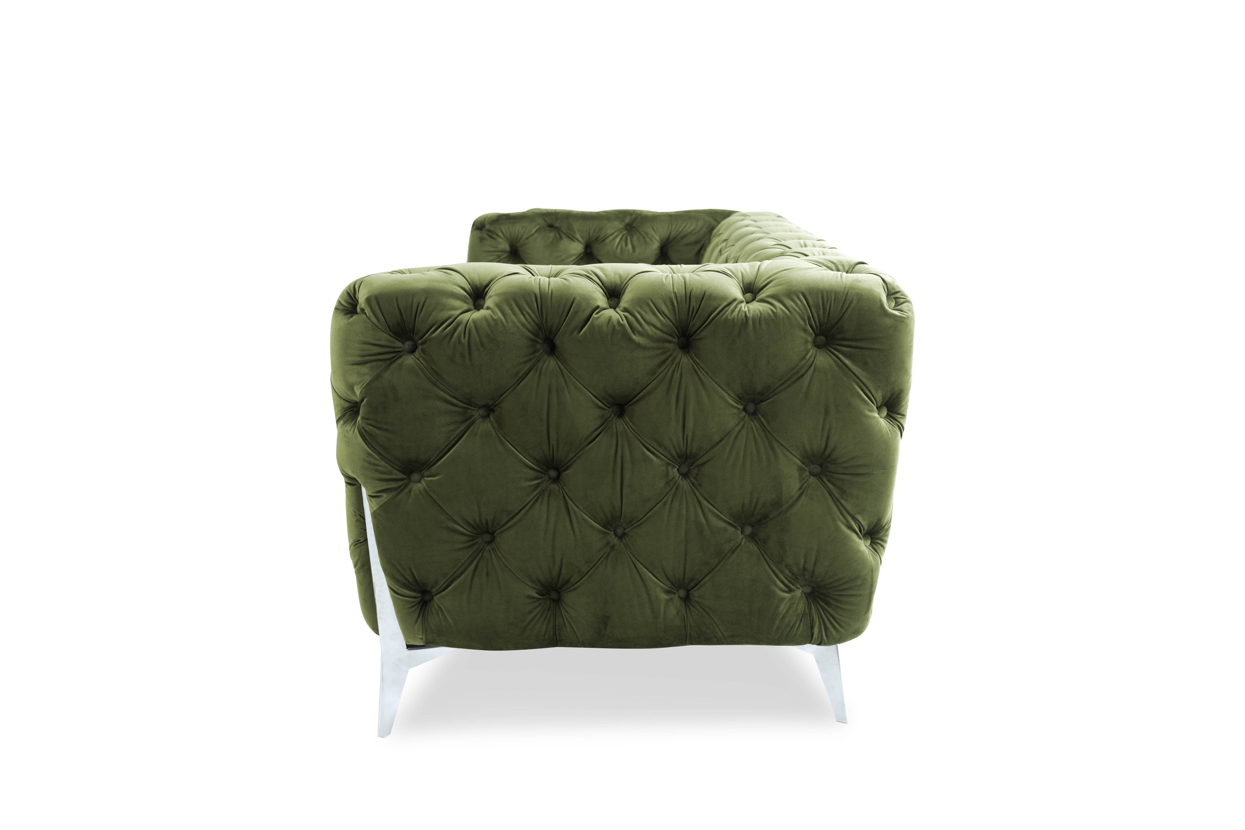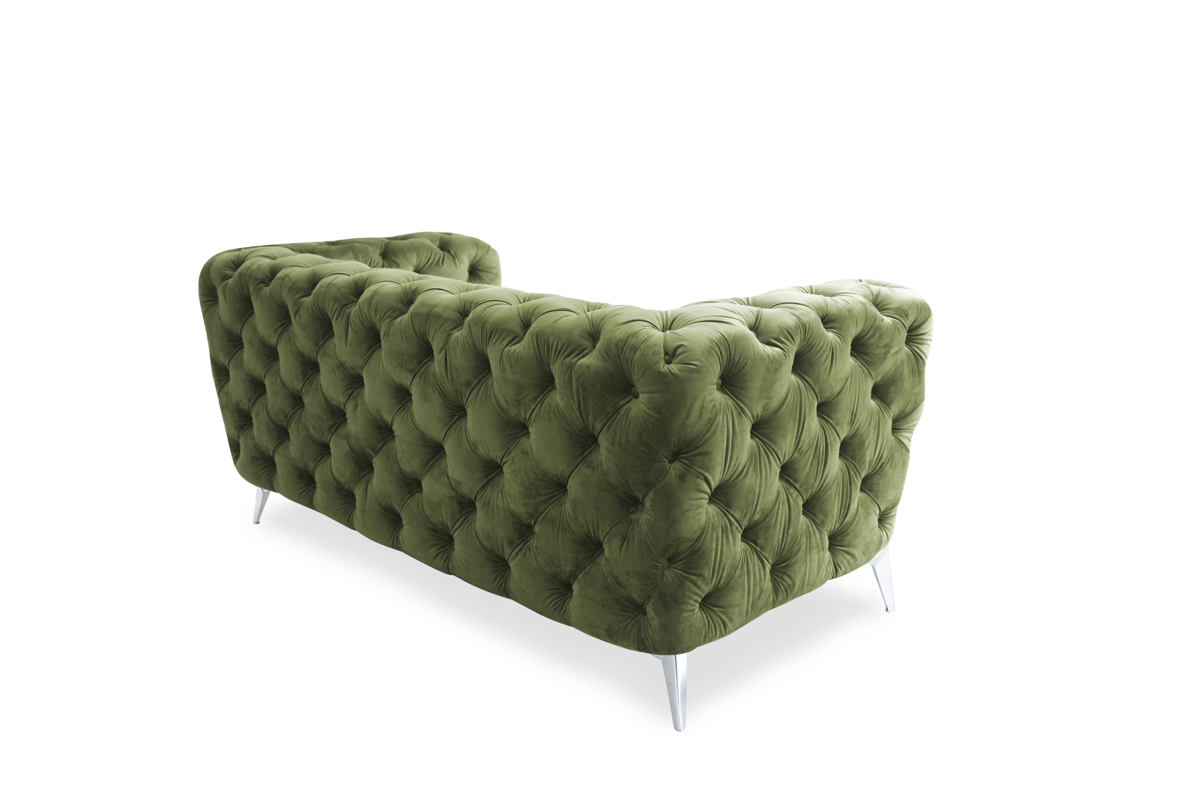 The Velvet Fabric Chesterfield Sage Green 2 Seater Alderley Sofa With Silver Feet is a luxurious and sophisticated addition to your living space. Crafted with meticulous attention to detail, this sofa boasts a high-quality soft brushed polyester velvet fabric upholstery that exudes elegance and offers a sumptuous feel. The entire surface of the sofa features deep chesterfield buttoning, adding a touch of classic charm and creating a visually stunning focal point.