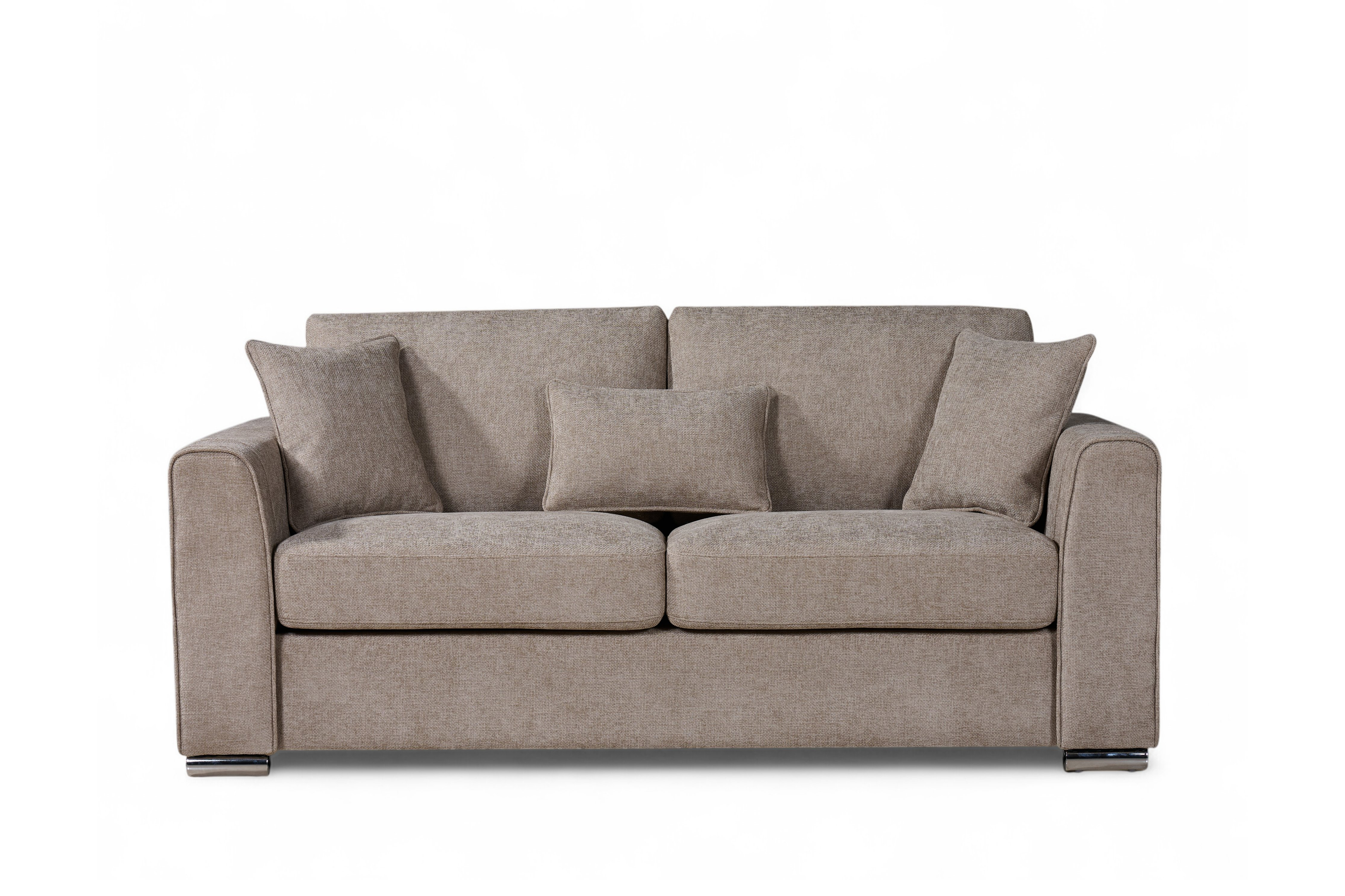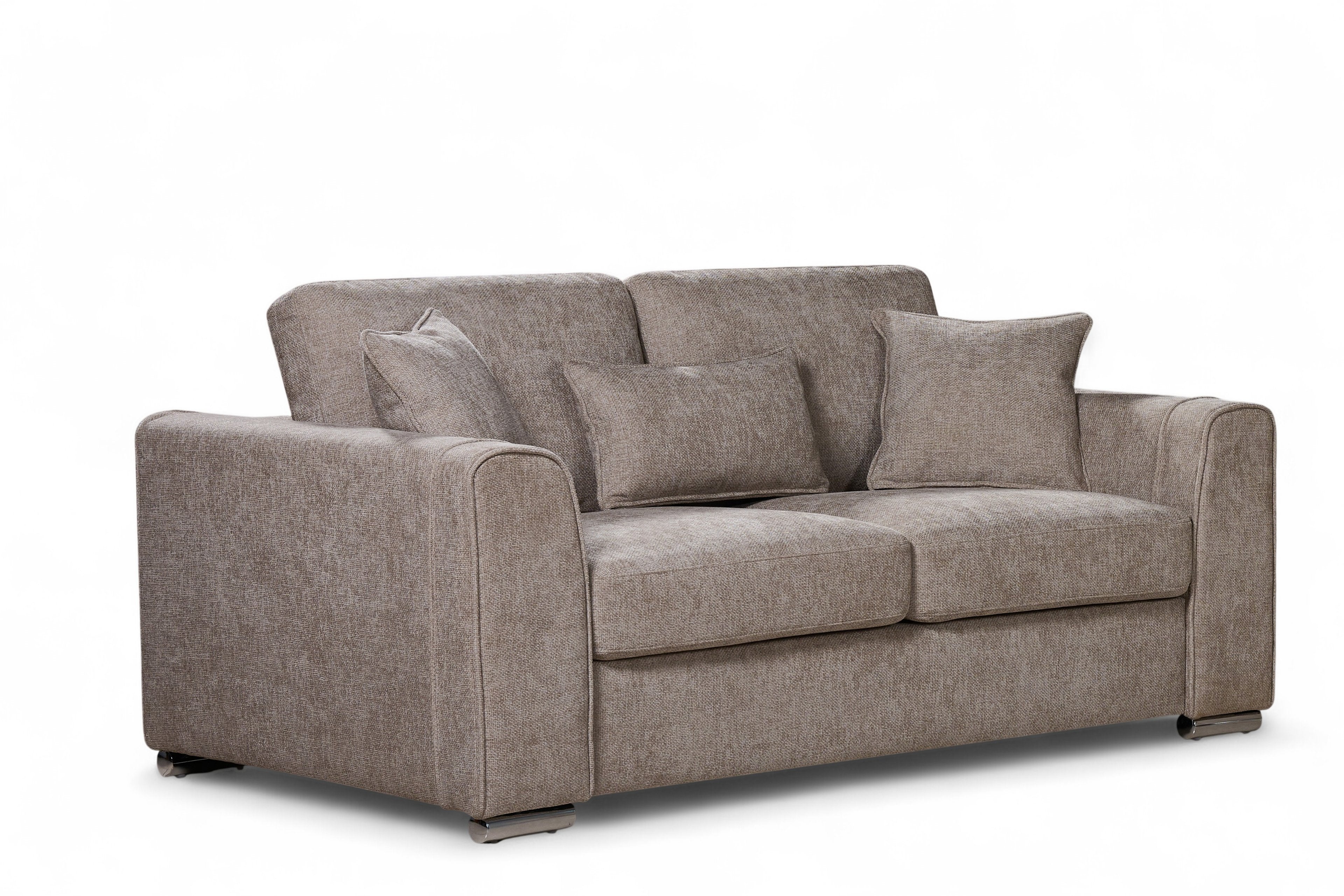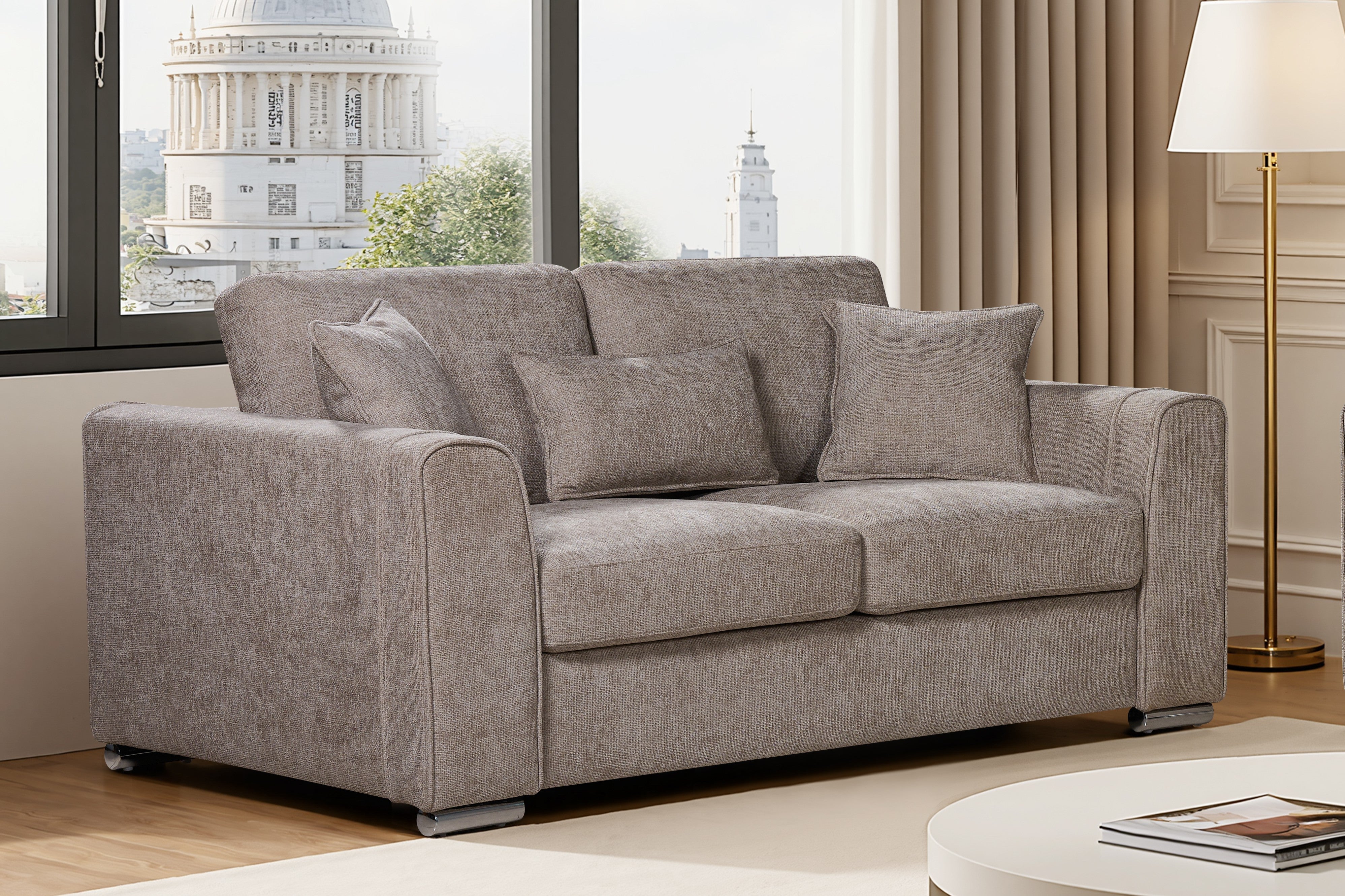 The Beige Chenille Fabric Logan 2 Seater Sofa showcases a sleek, contemporary silhouette upholstered in a soft, textured chenille fabric in a versatile grey tone. Designed for everyday comfort, it features fixed back cushions and generously padded seats. Straight arms and silver modern legs lend it a refined, well-proportioned appearance, while two matching scatter cushions complete the look.