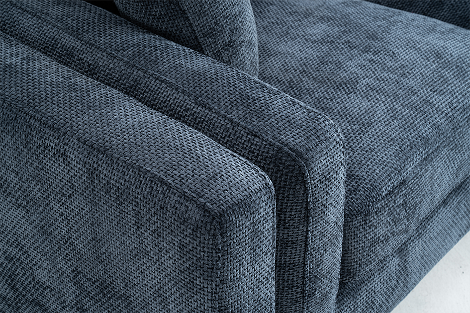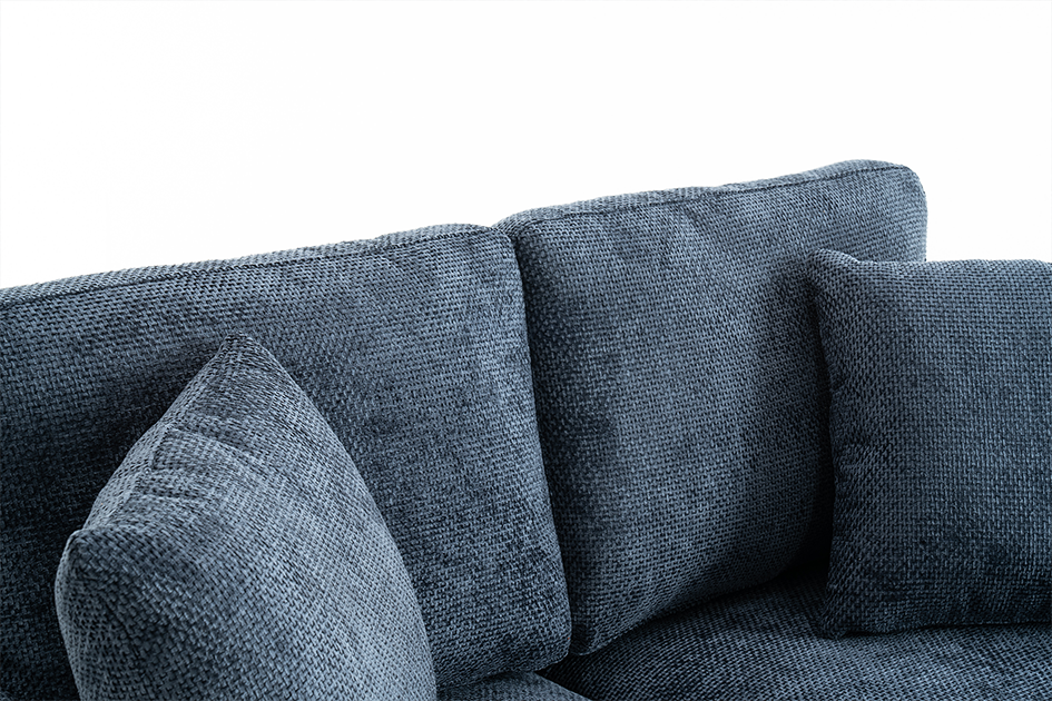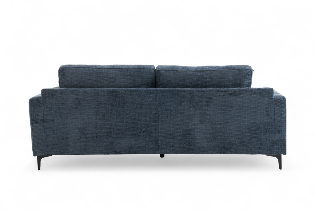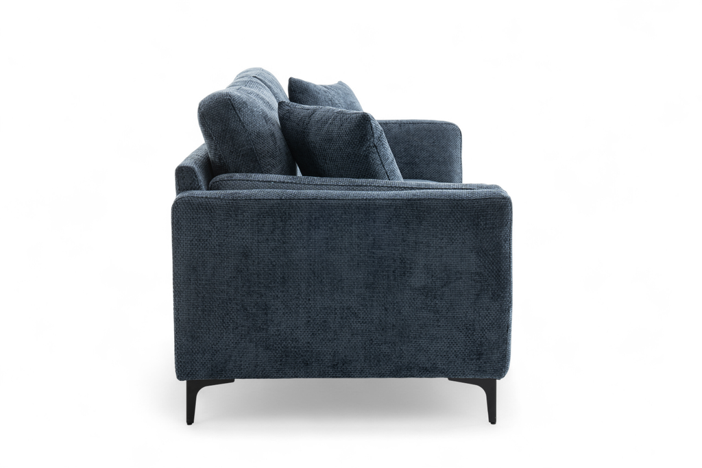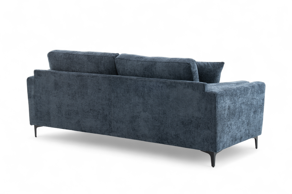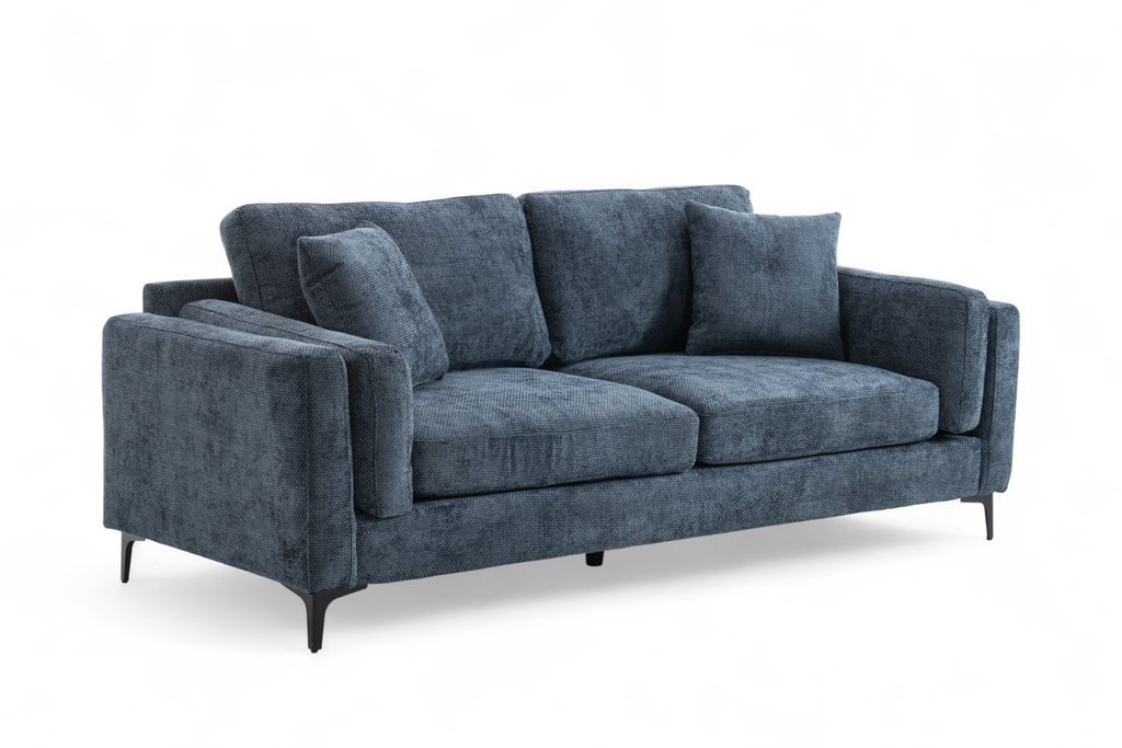 The Marghera is an elegant, contemporary-style sofa. It is upholstered in beautiful woven chenille in blue. It is built on a hardwood frame, with pocket-sprung medium density foam-filled seats. Alongside the fixed backrest cushions, it comes with matching accent cushions and side cushions. The black angled feet add to the modern silhouette of this sofa. This 3 seater variant is quite compact and perfect for a variety of spaces, whether used on its own or as part of a bigger ensemble.