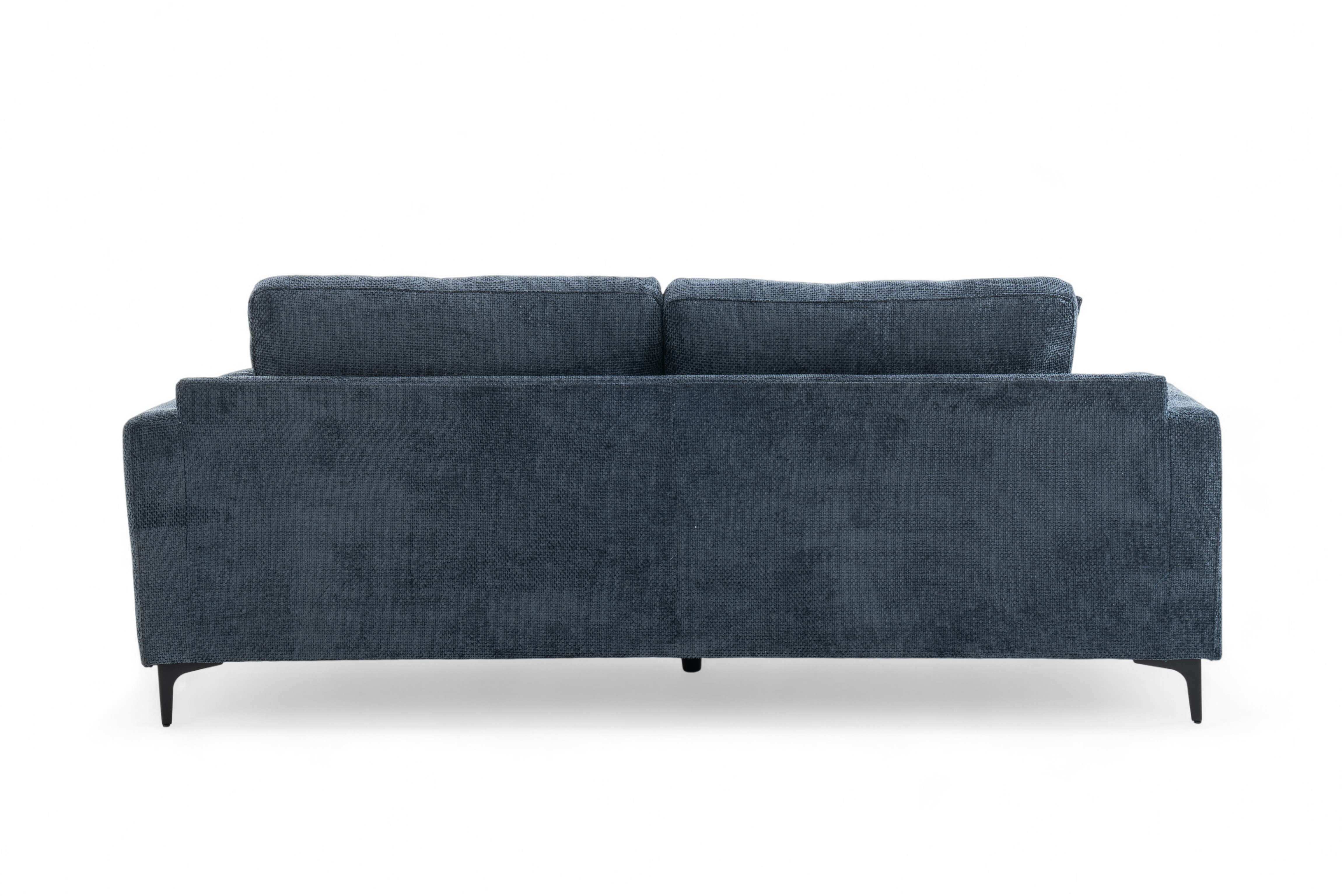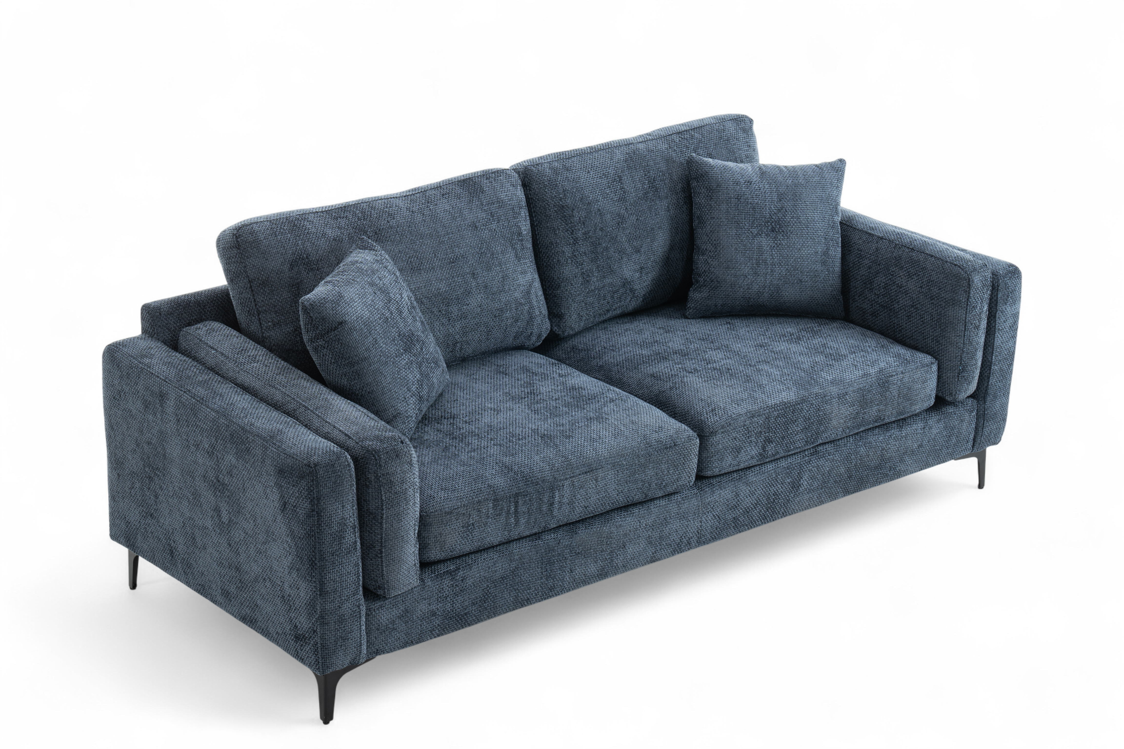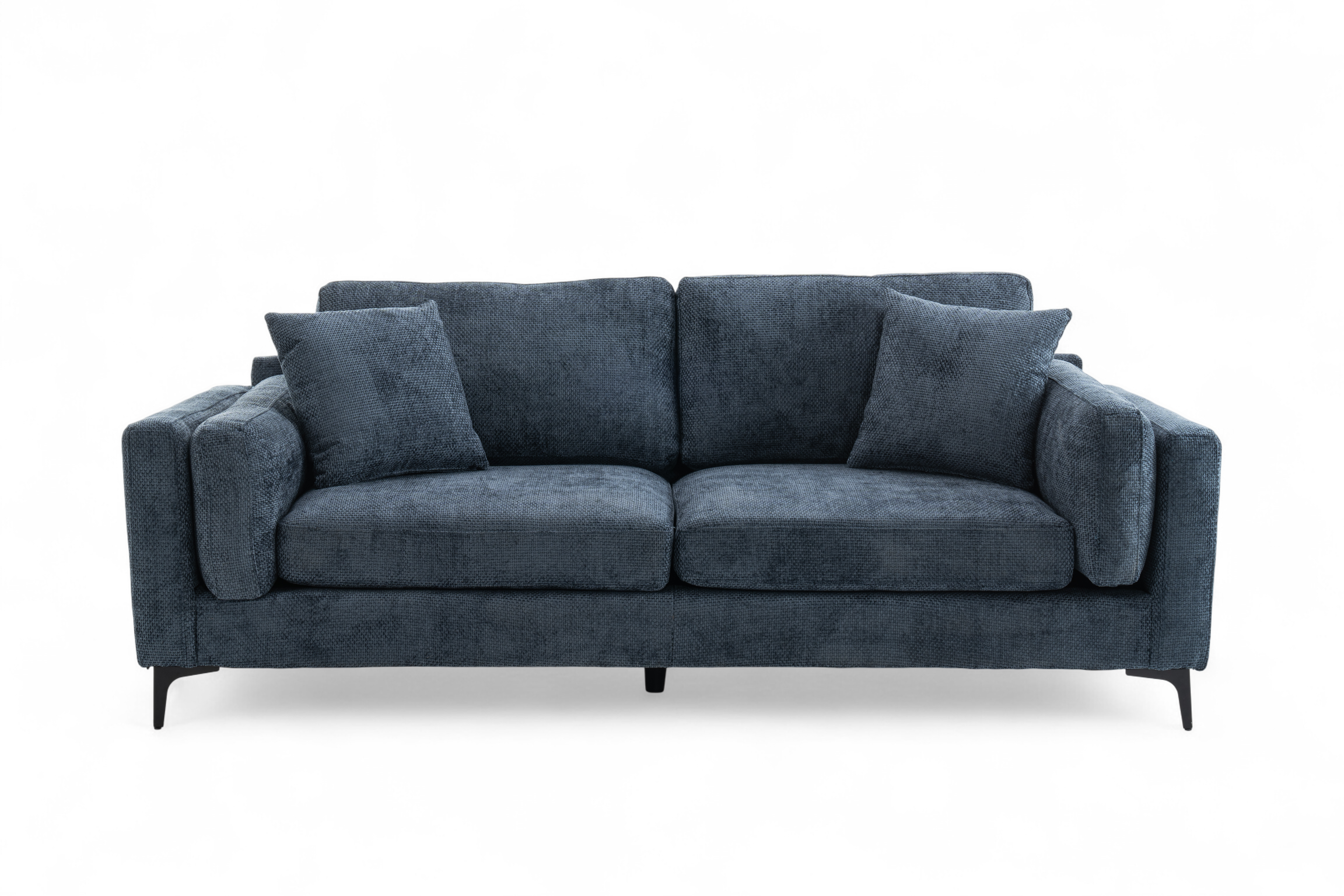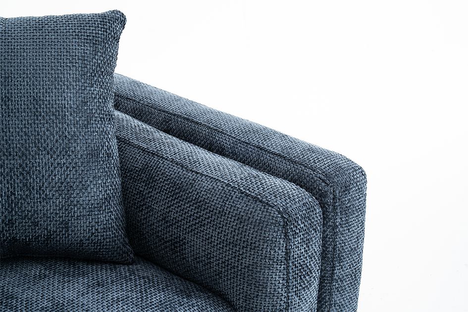 The Marghera is an elegant, contemporary-style sofa. It is upholstered in beautiful woven chenille in blue. It is built on a hardwood frame, with pocket-sprung medium density foam-filled seats. Alongside the fixed backrest cushions, it comes with matching accent cushions and side cushions. The black angled feet add to the modern silhouette of this sofa. This 3 seater variant is quite compact and perfect for a variety of spaces, whether used on its own or as part of a bigger ensemble.
